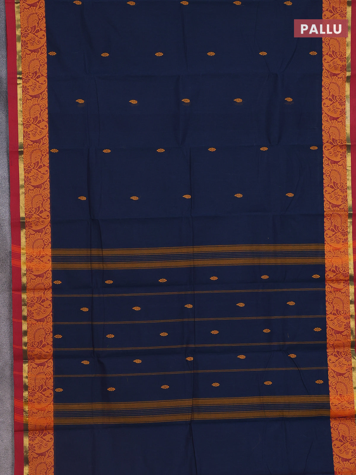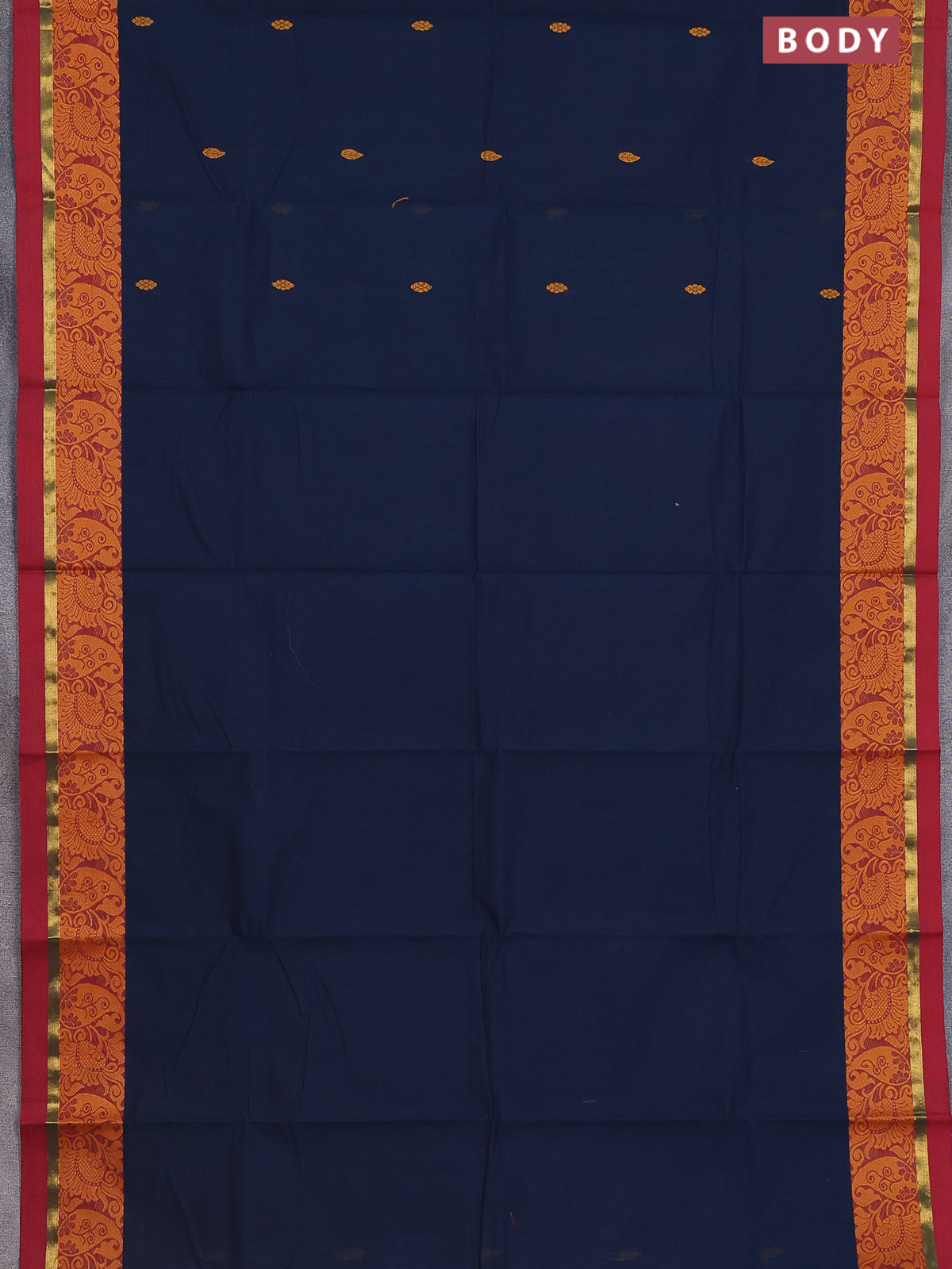 Chettinad cotton saree dark peacock blue and maroon with thread woven buttas and thread & zari woven border