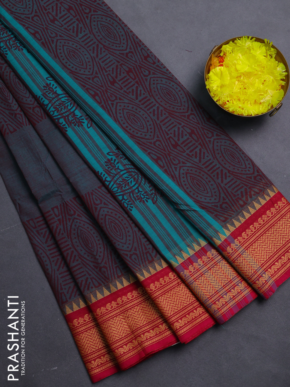 Chettinad cotton saree dual shade of peacock blue and pink with allover prints and thread woven border