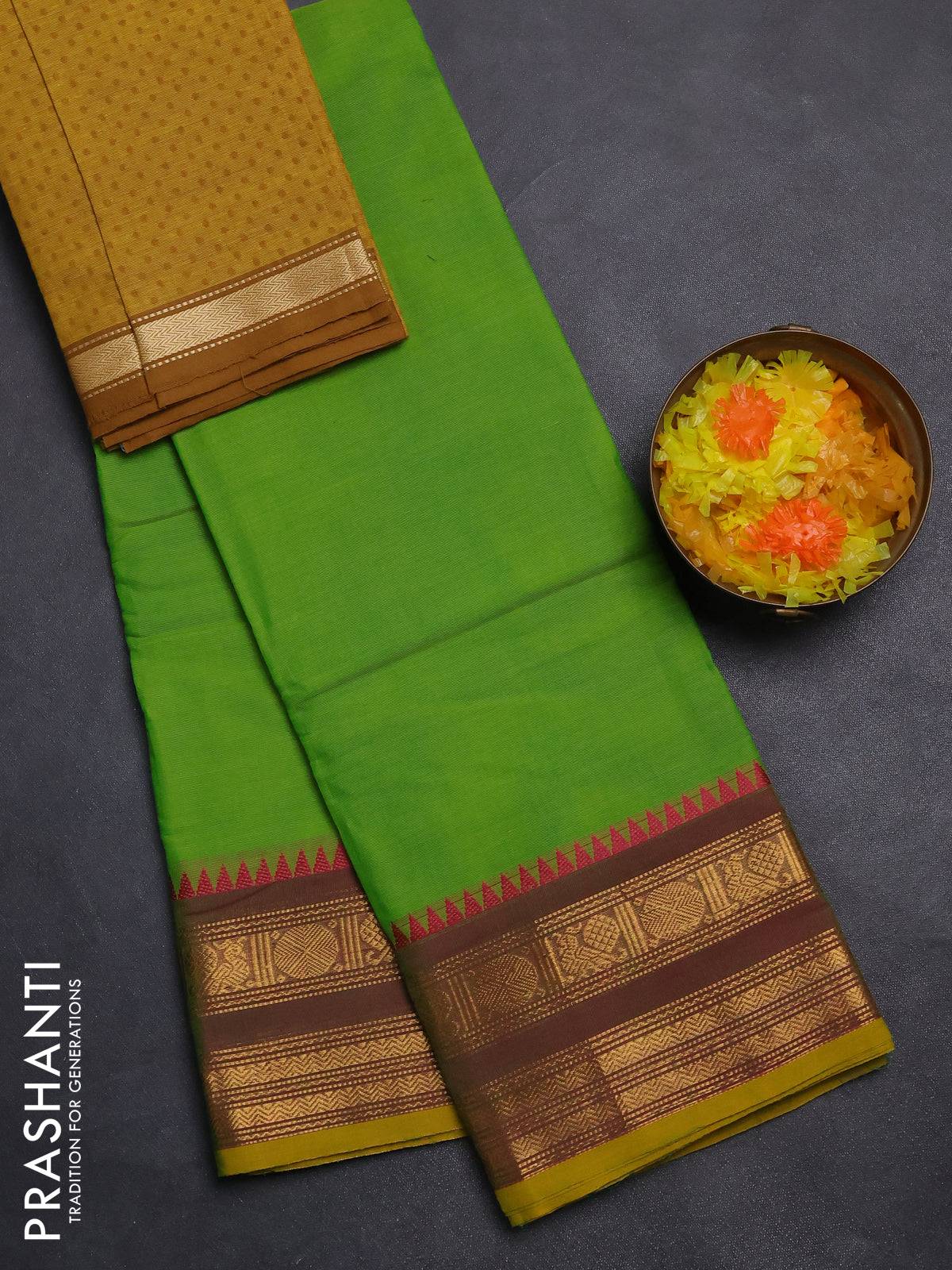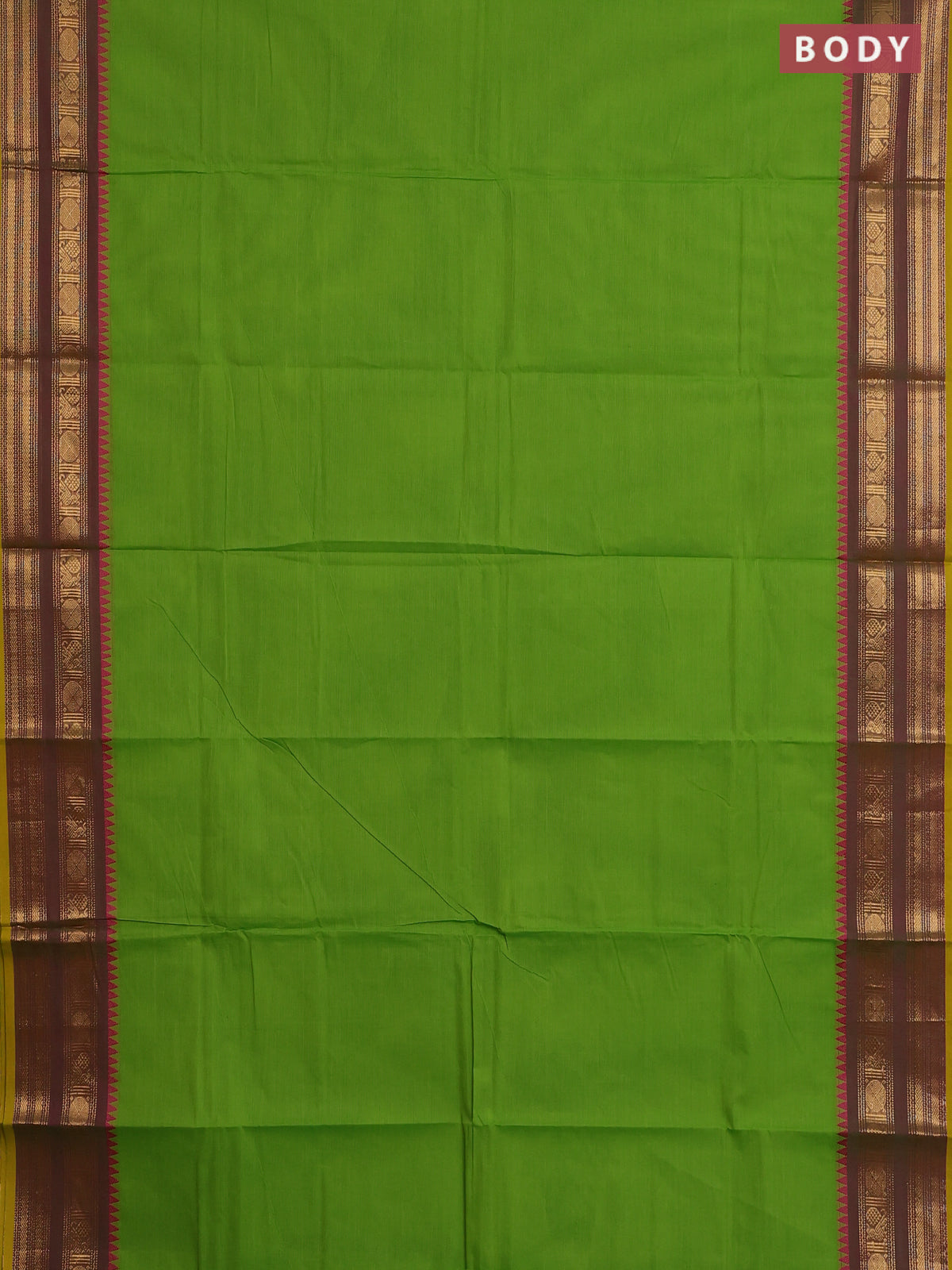 Chettinad cotton saree light green and yellow with plain body and rettapet zari woven border