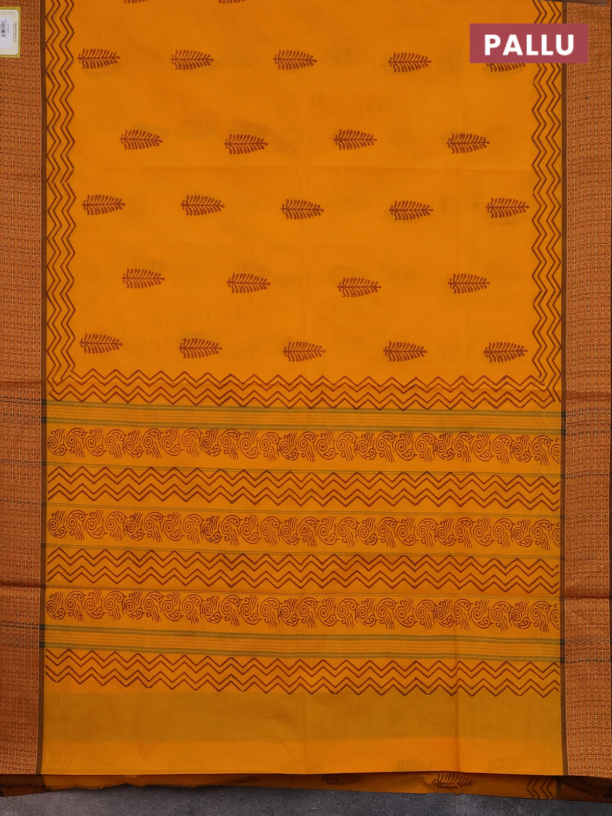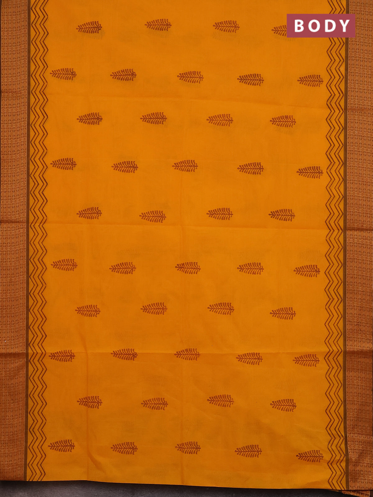 Chettinad cotton saree mango yellow and brown with allover block prints and thread woven border