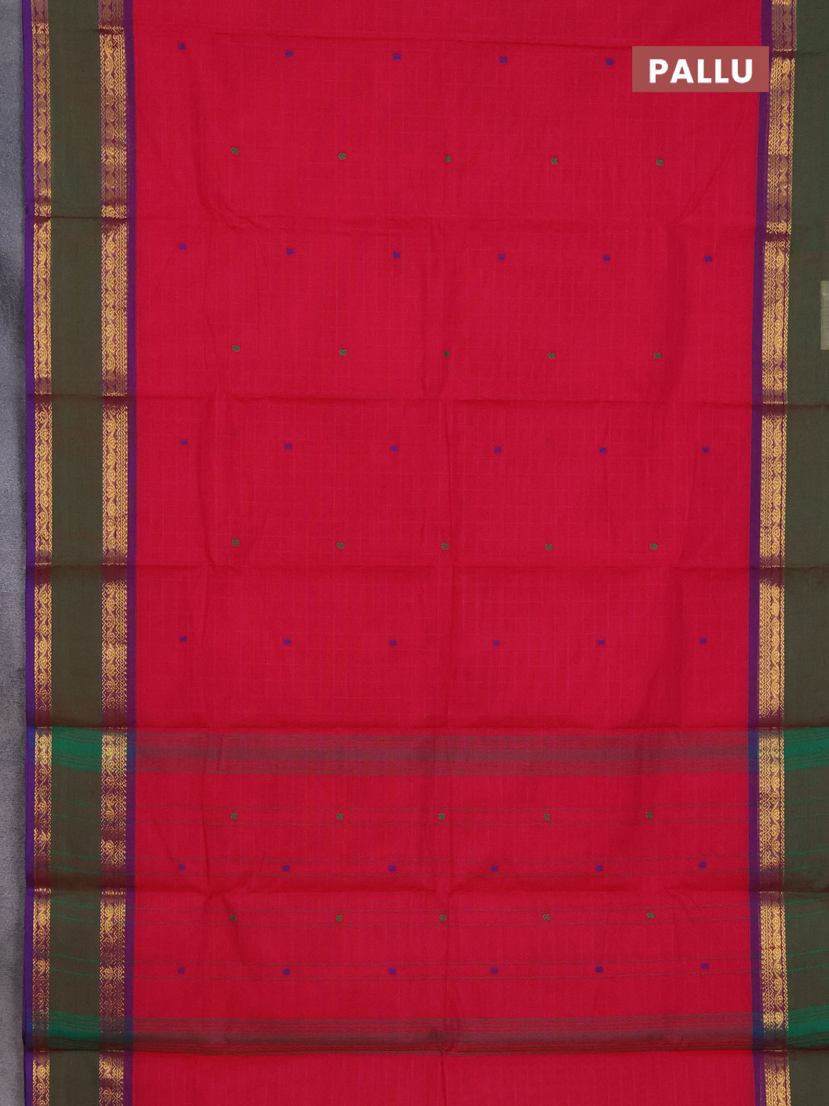 Chettinad cotton saree reddish pink and manthulir green with allover checked pattern and rattapet zari woven border