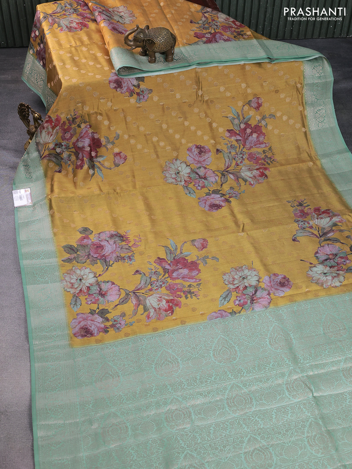Chiniya silk saree dark mustard and pastel blue shade with allover woven buttas & floral digital prints and zari woven border