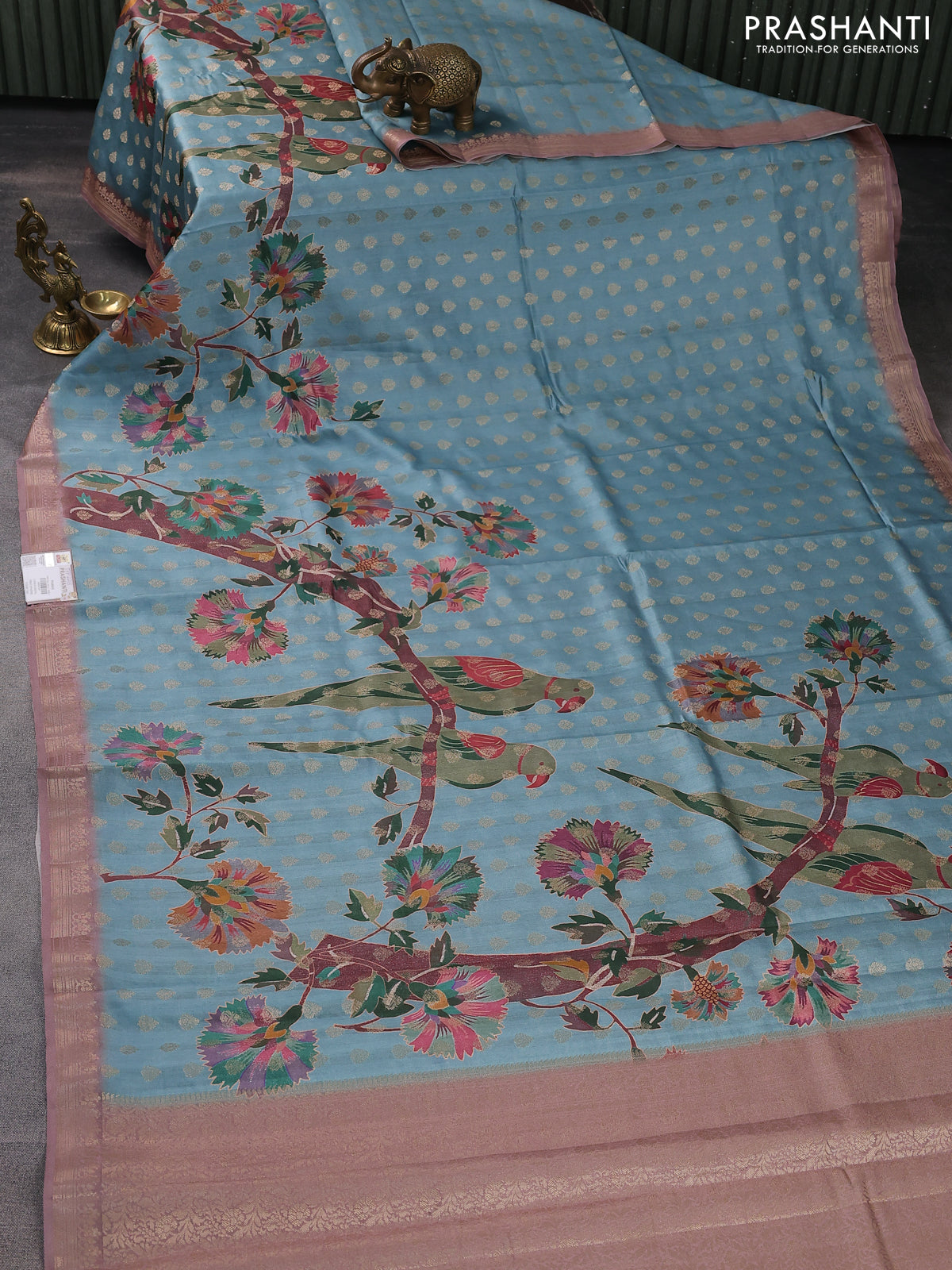 Chiniya silk saree pastel blue and mauve pink with woven buttas & digital prints and zari woven border
