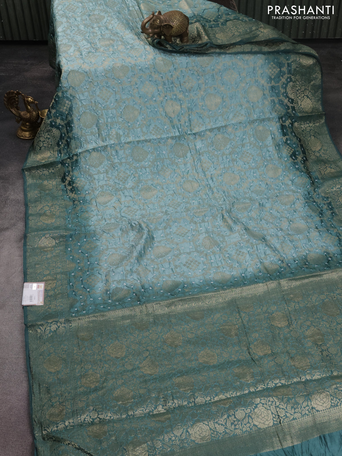 Chiniya silk saree pastel blue and pastel green shade with allover bandhani prints & zari weaves and zari woven border