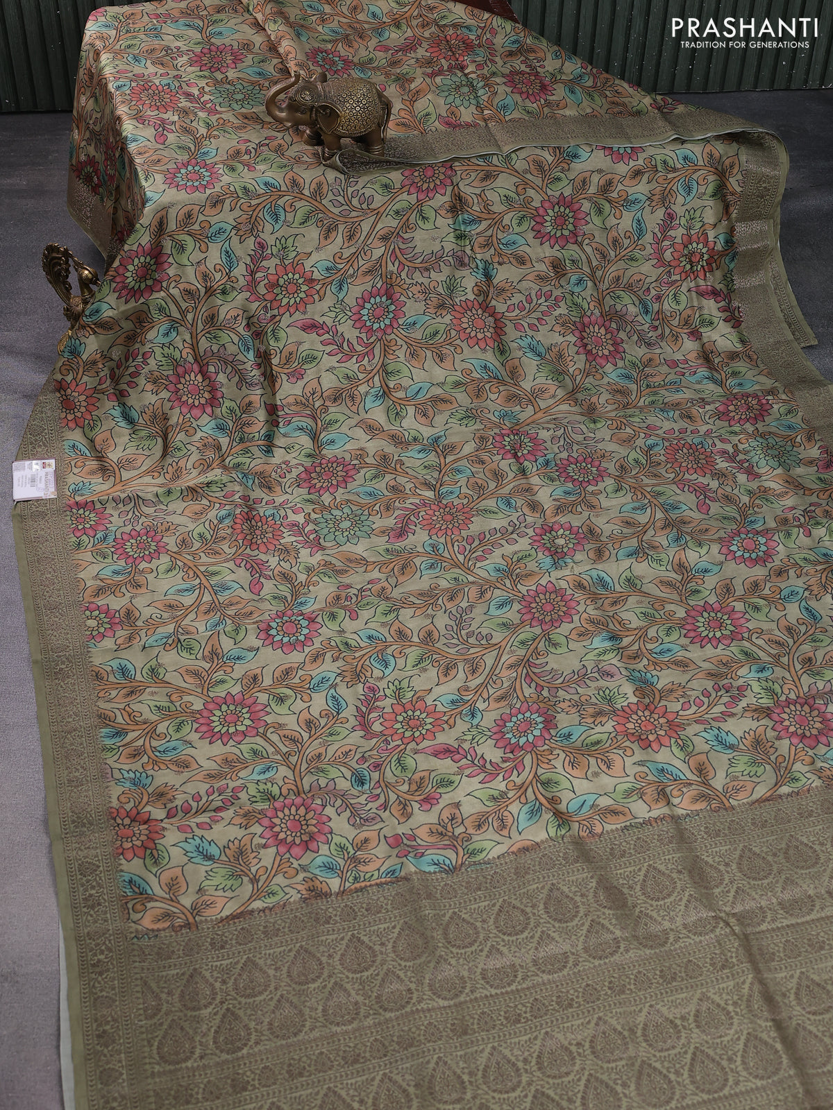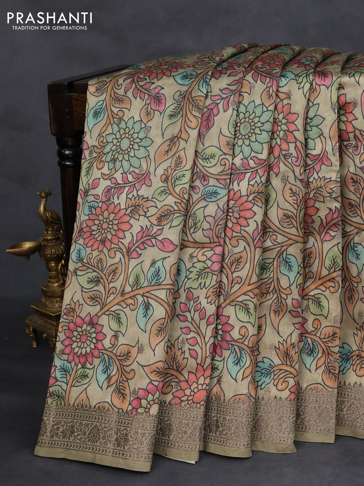 Chiniya silk saree pastel green with allover woven buttas & kalamkari digital prints and banarasi style border