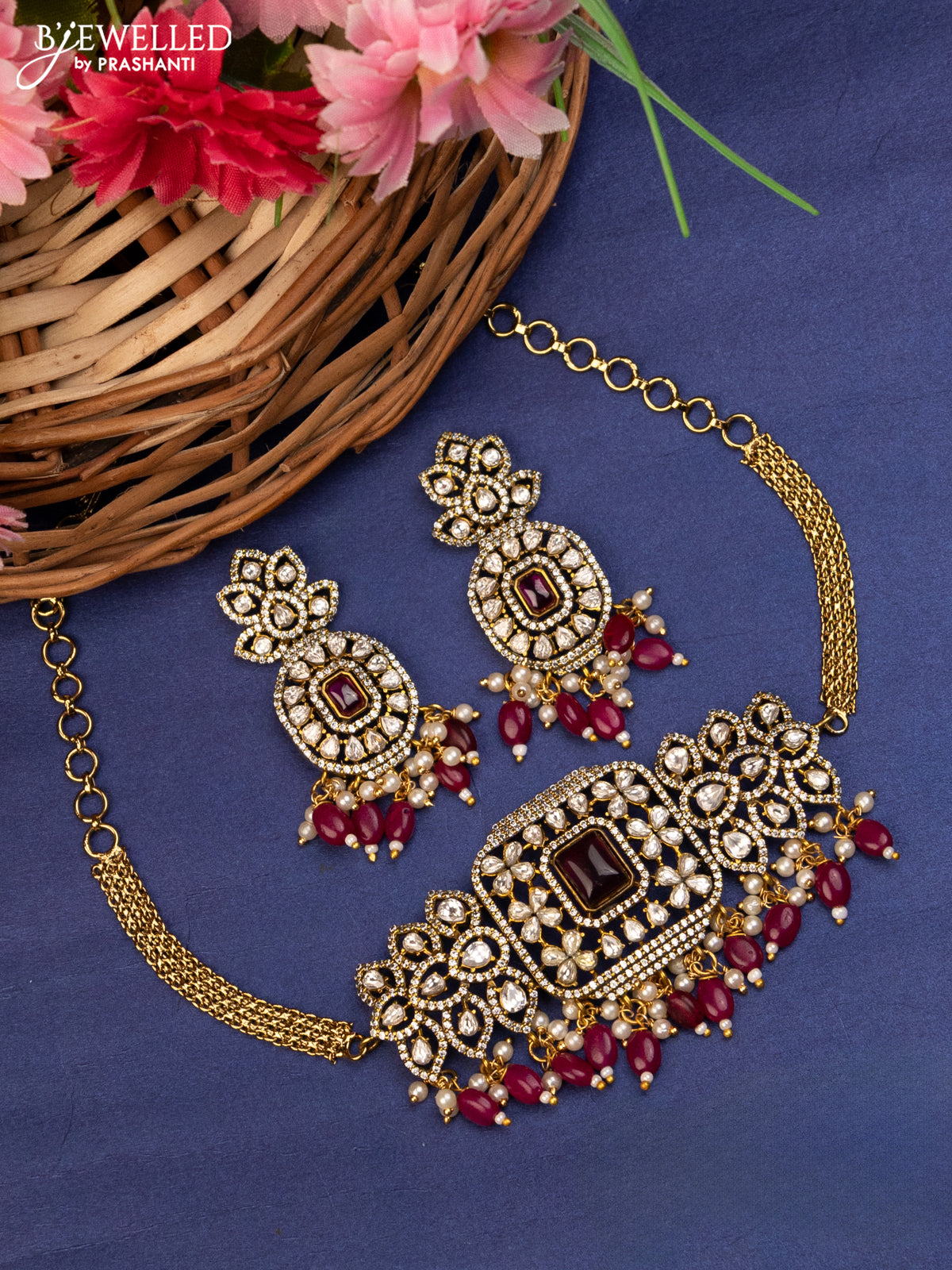 Choker with ruby & kundan stones and beads hanging in victorian finish
