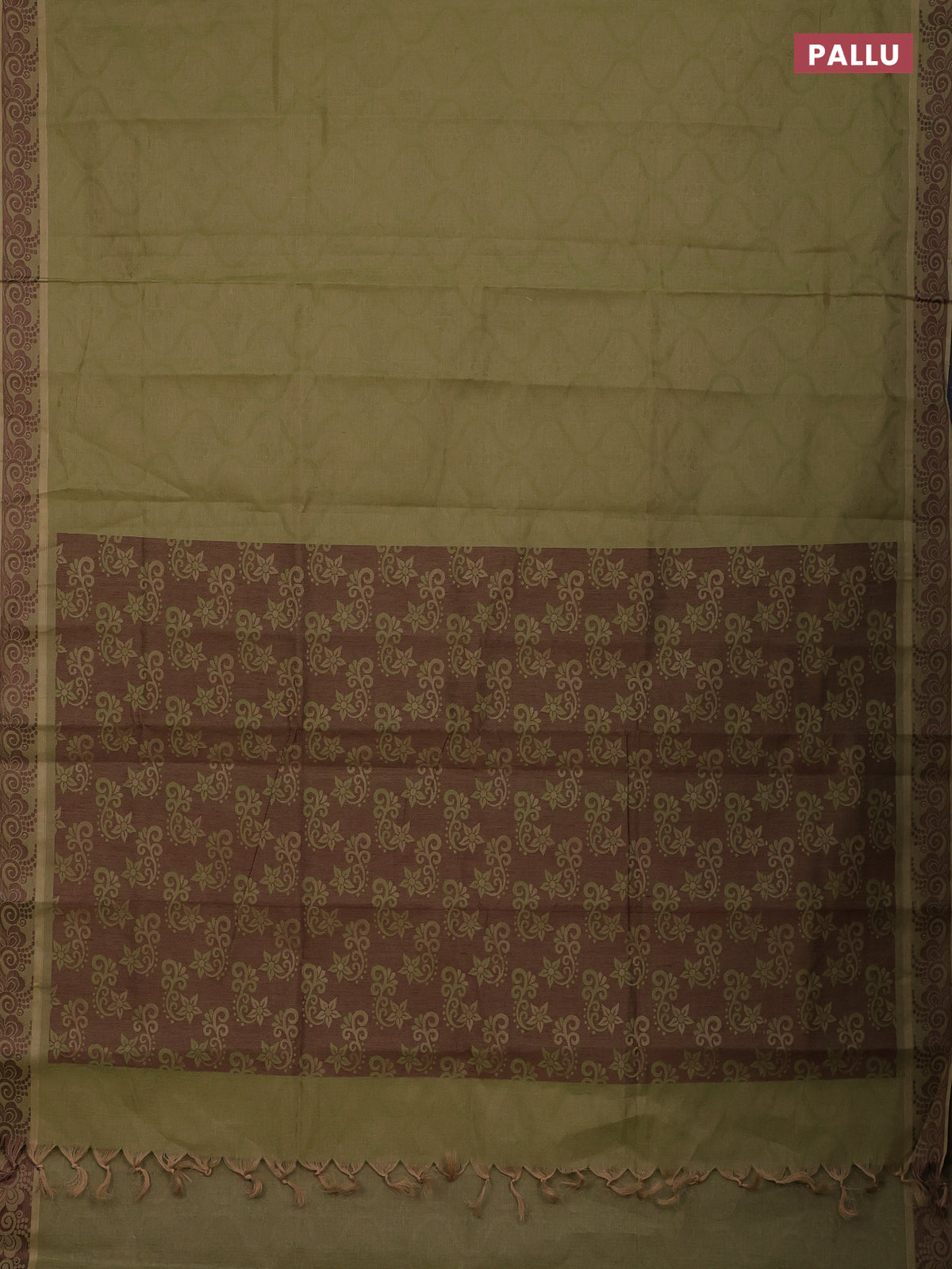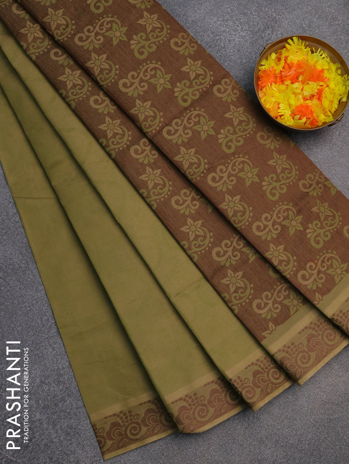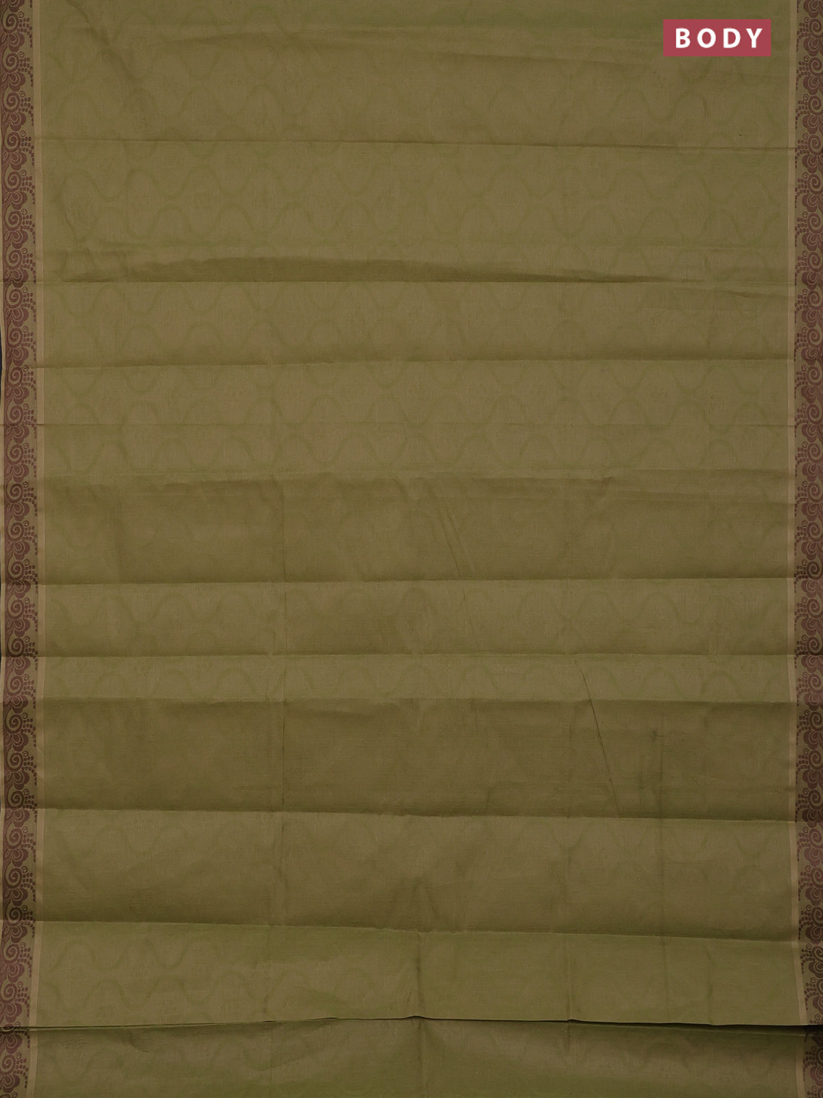 Coimbatore cotton saree sap green and coffee brown with allover self emboss and thread woven border