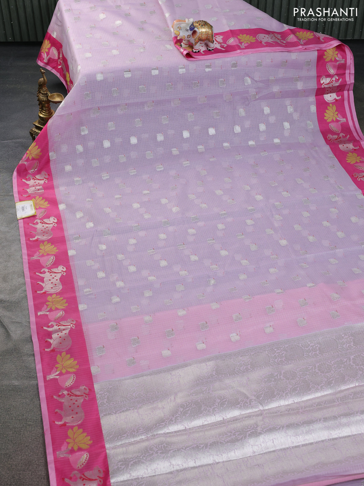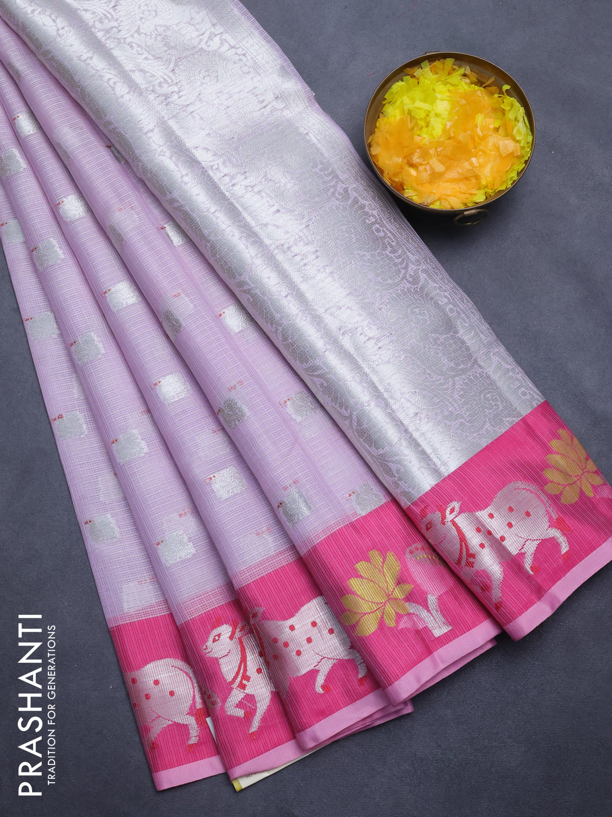 Cotton zari kota saree pastel lavender and pink with silver zari woven buttas and pichwai design zari border