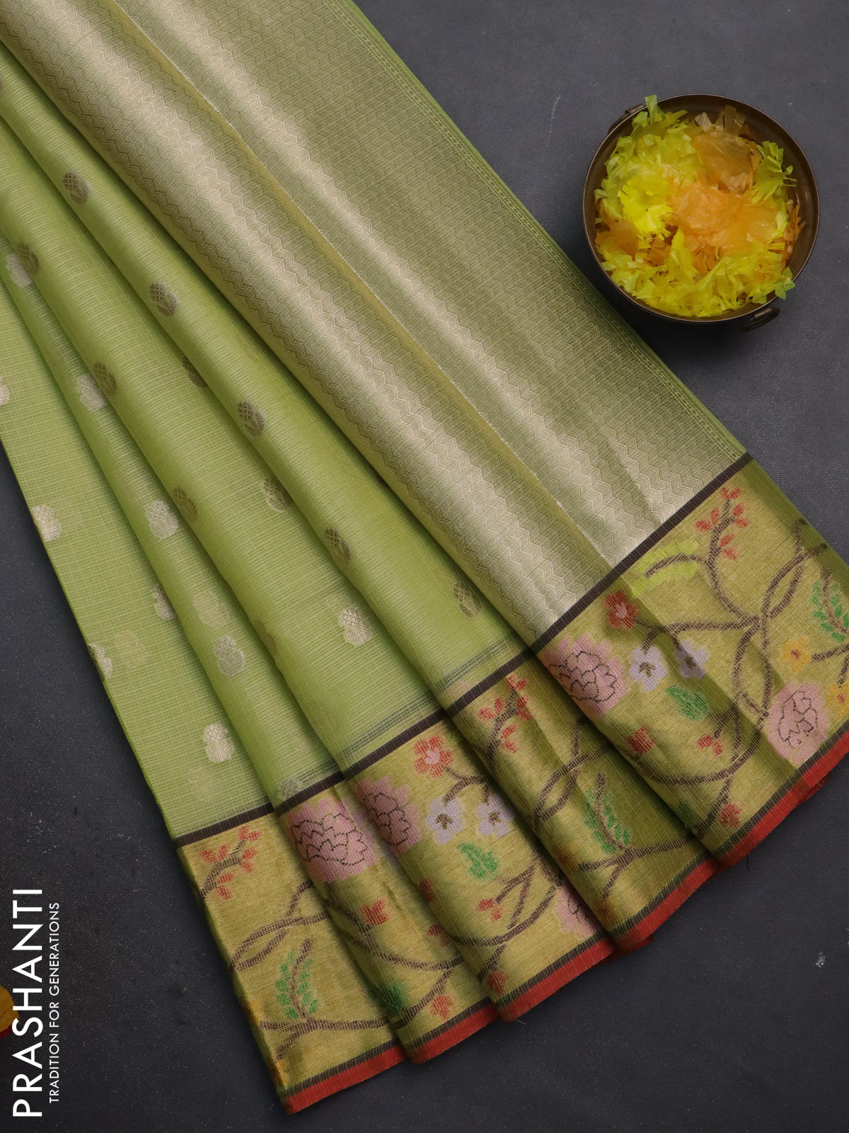 Cotton zari kota saree pista green and red with zari woven buttas and zari woven paithani style border