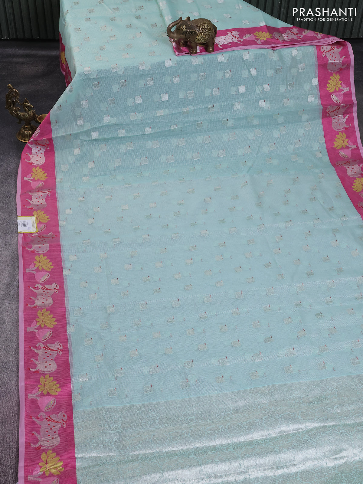 Cotton zari kota saree teal blue and pink with silver zari woven buttas and pichwai design zari border
