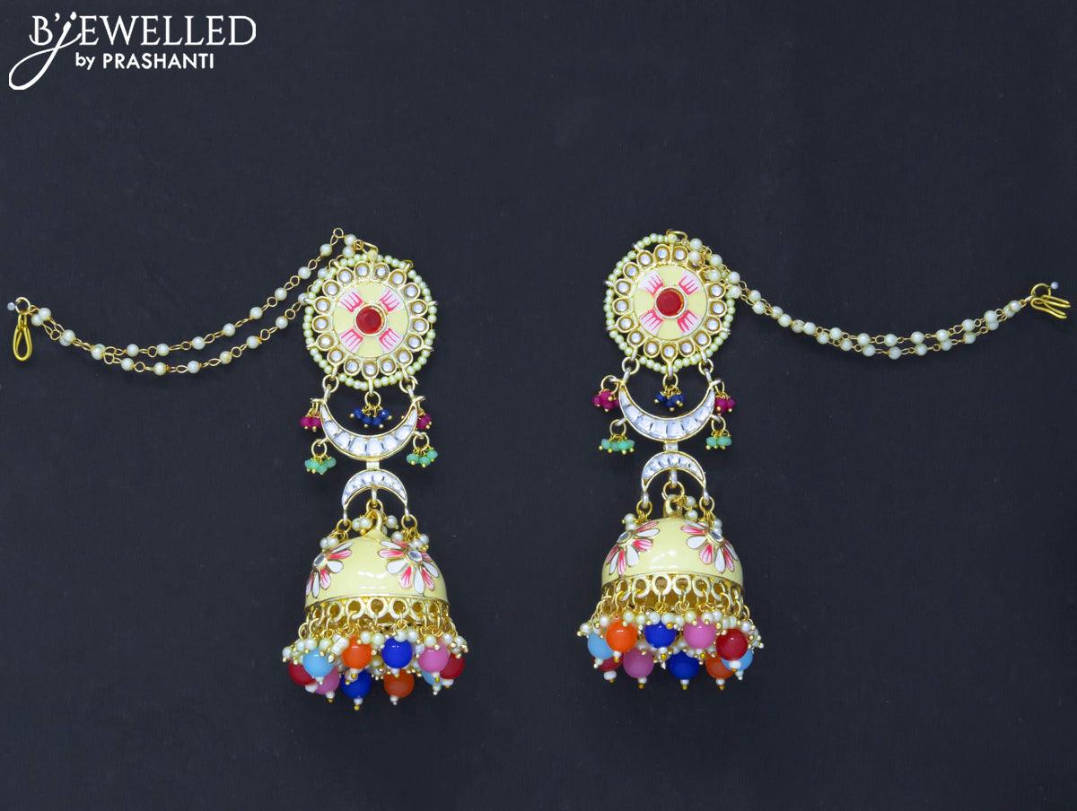 Dangler jhumkas with multicolour beads hanging and pearl maatal