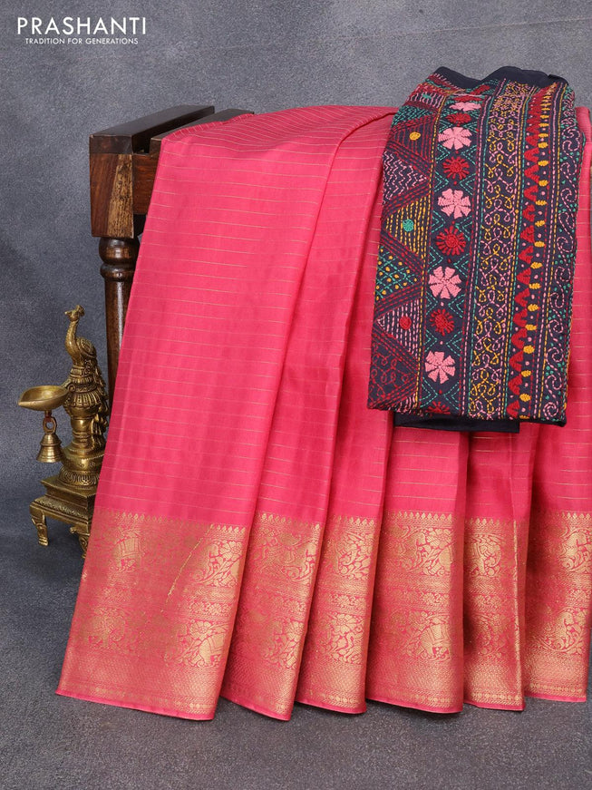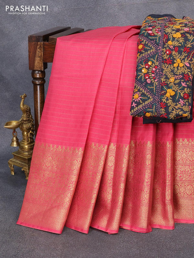 Dola silk saree pink shade and green with allover zari woven stripes pattern and long zari woven border with embroidery work blouse