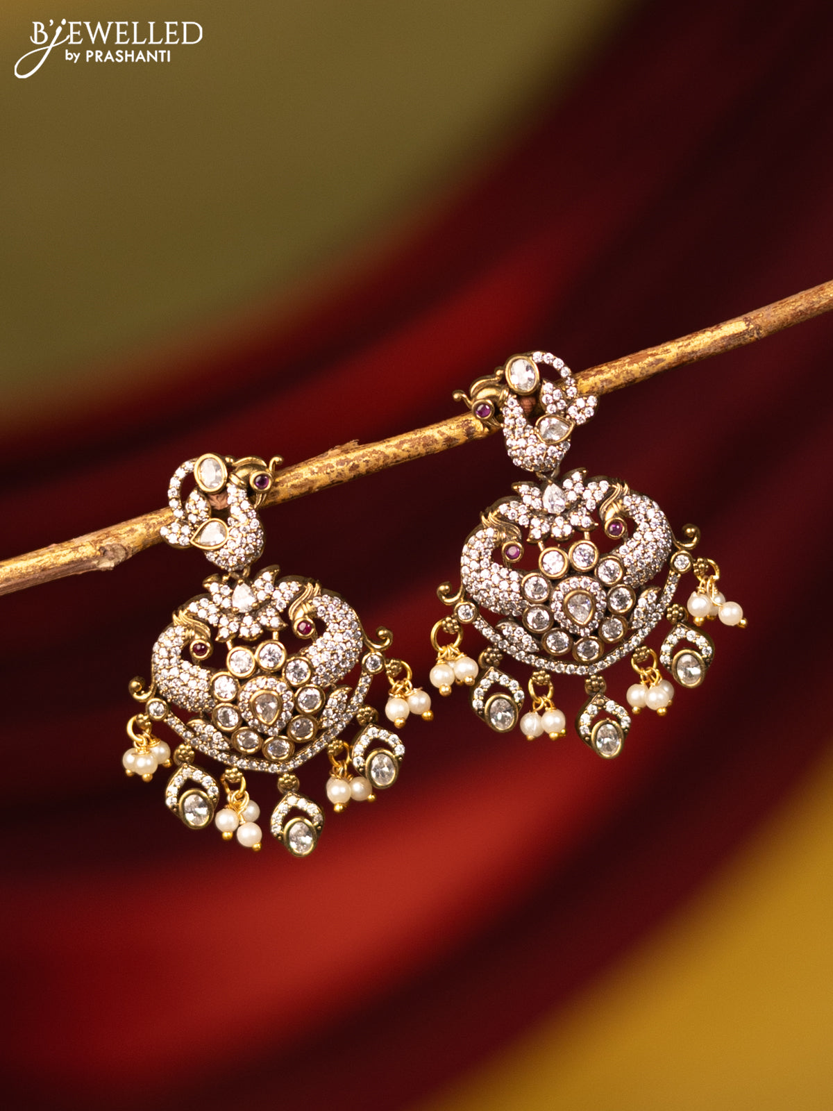 Earrings peacock design with cz stones and pearl hangings in victorian finish