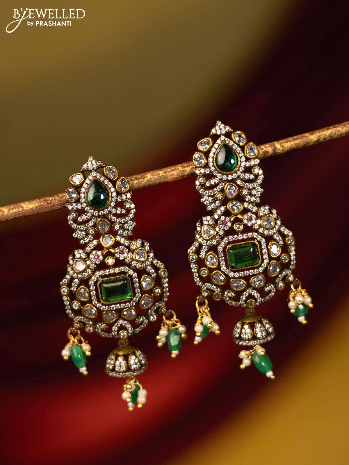 Earrings with emerald & cz stones and beads hanging in victorian finish