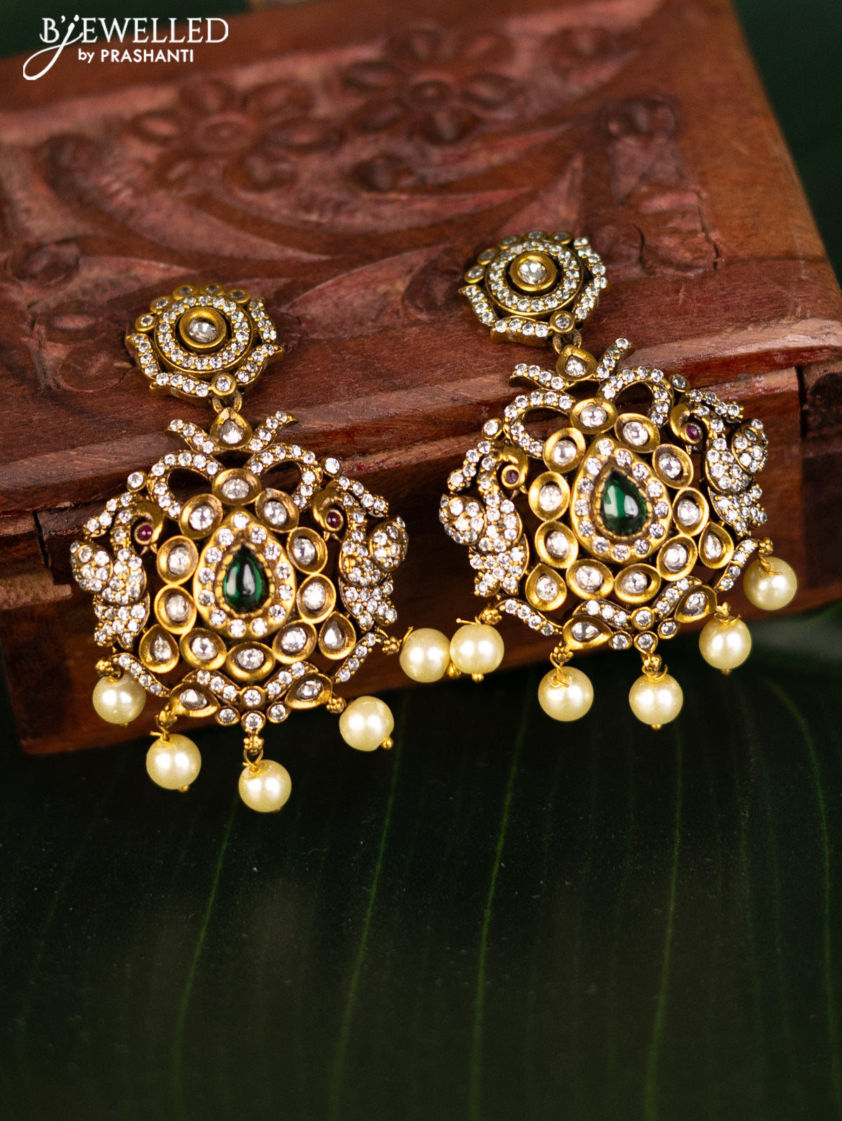 Earrings with emerald & cz stones and pearl hangings in victorian finish