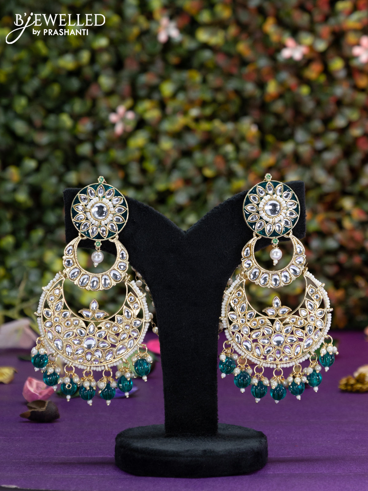 Fashion dangler chanbali teal green minakari earrings with kundan stones and beads hangings