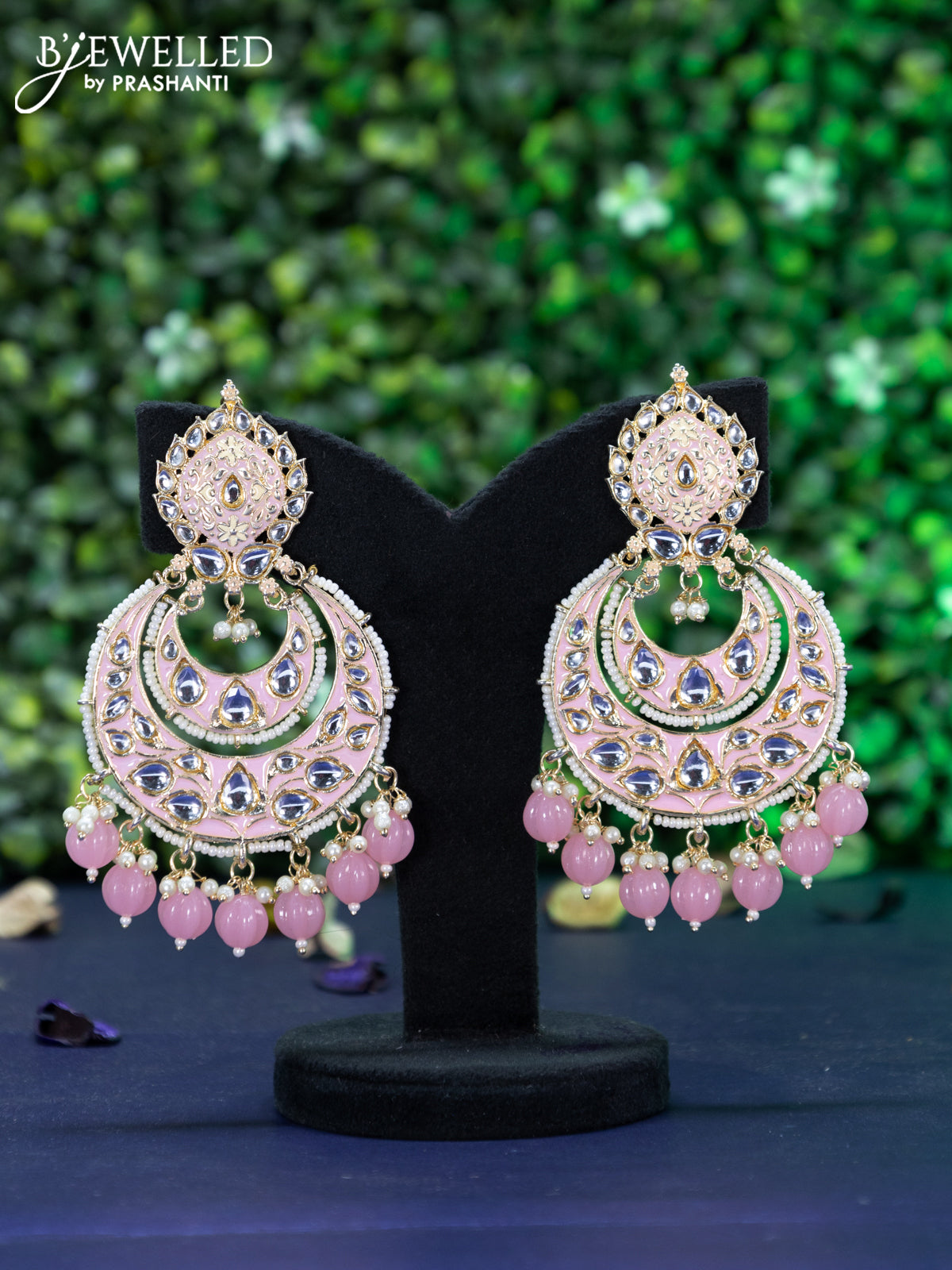 Fashion dangler chandbali pink minakari earrings with kundan stones and beads hanging