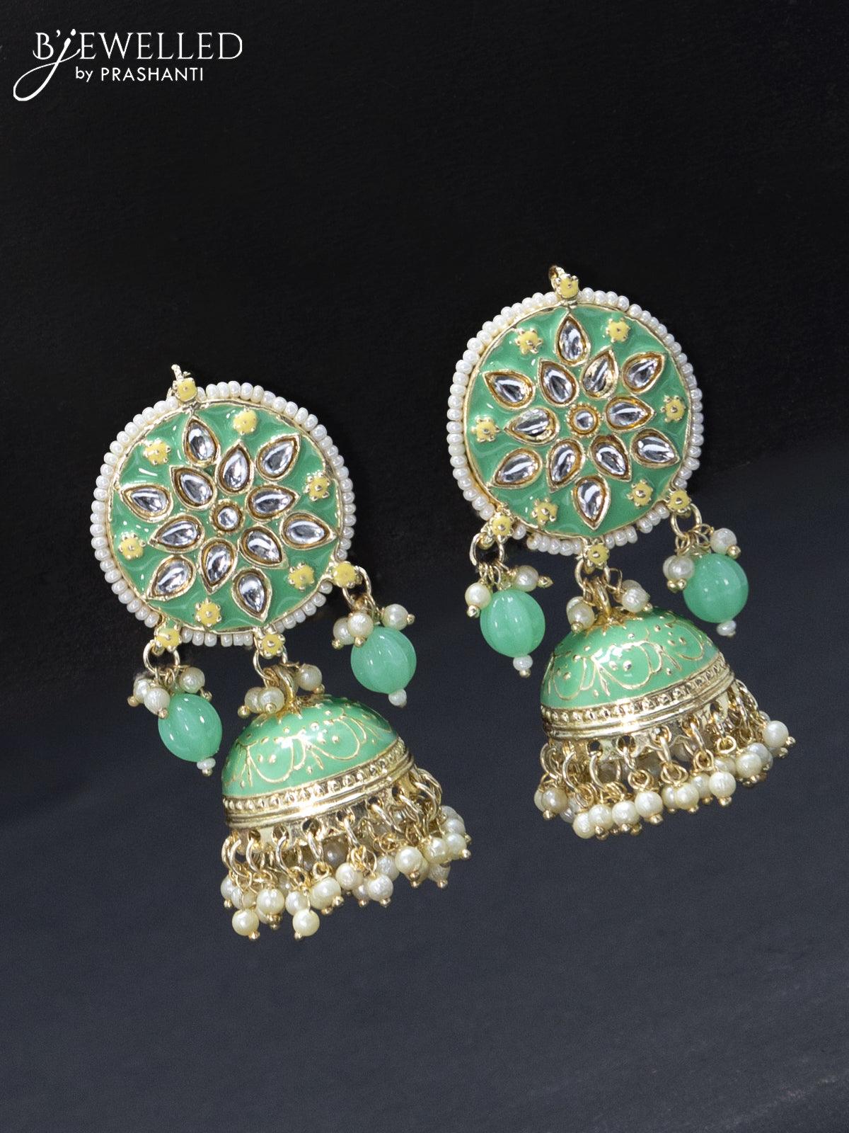 Fashion dangler jhumkas with mint green minakari and pearl hangings