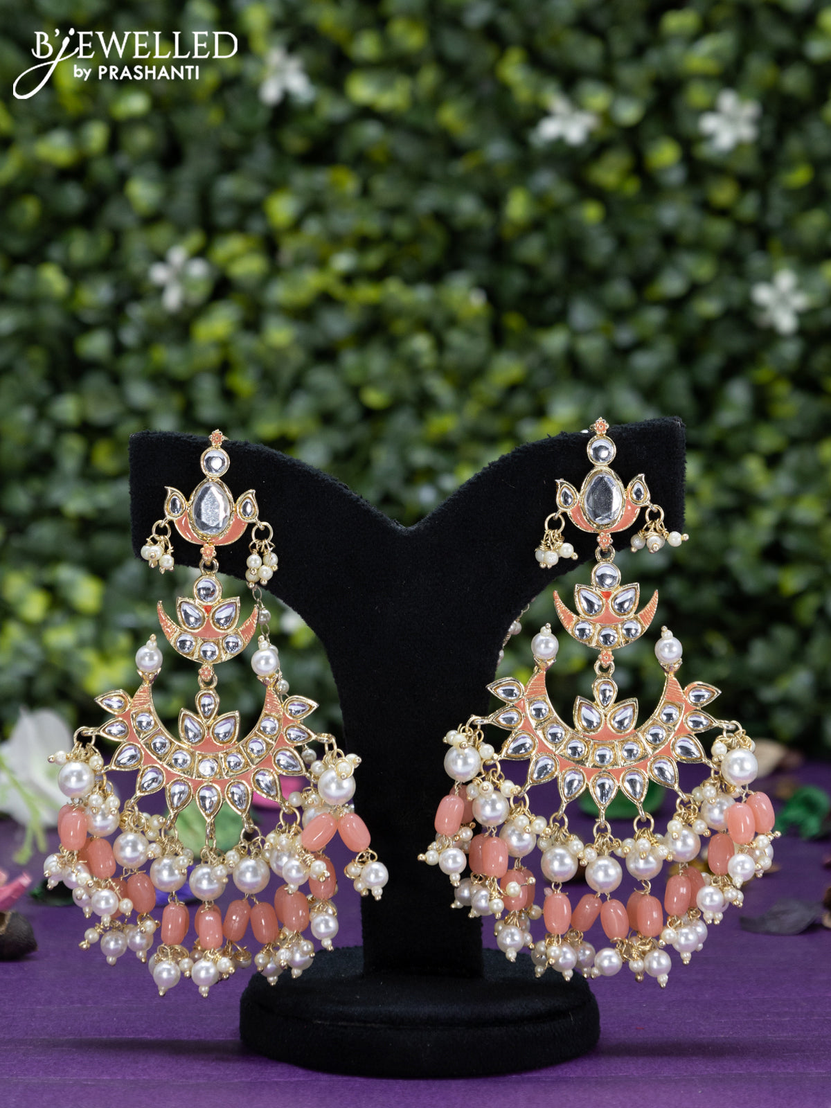Fashion dangler peach earrings chandbali design with kundan stones and beads hangings