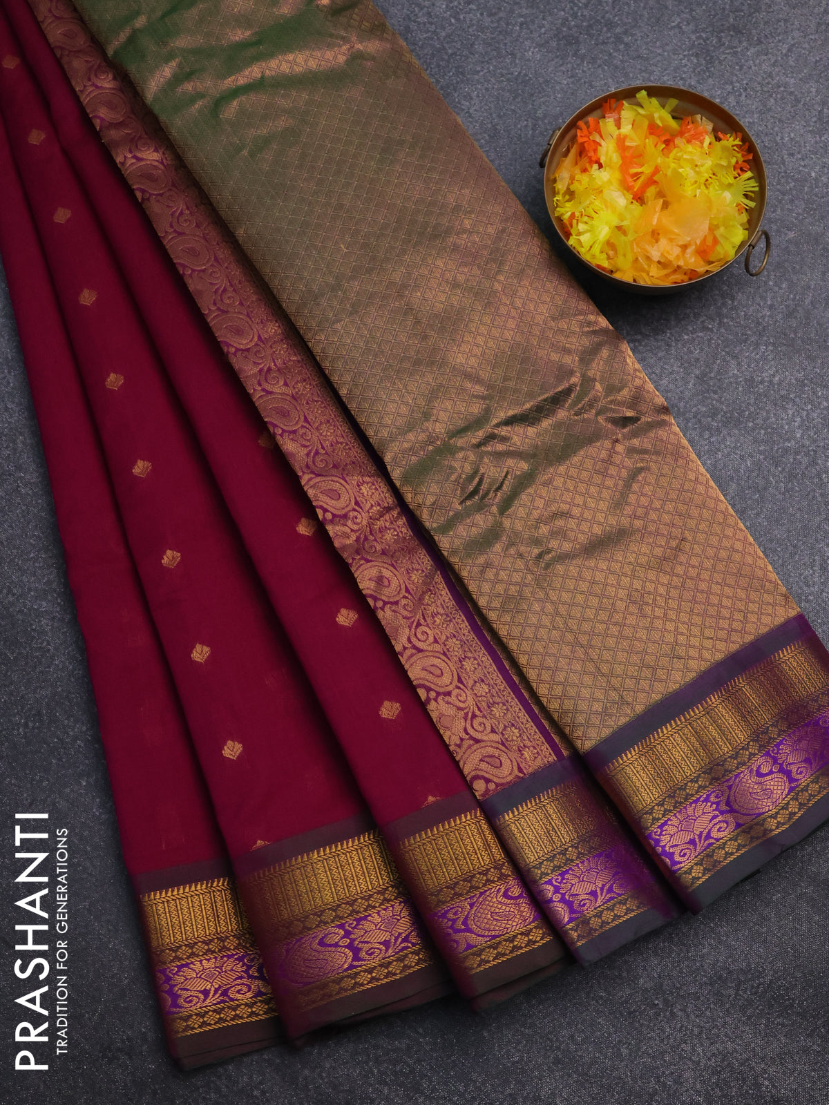Gadwal silk cotton saree purple and dual shade of green with zari woven buttas and zari woven border