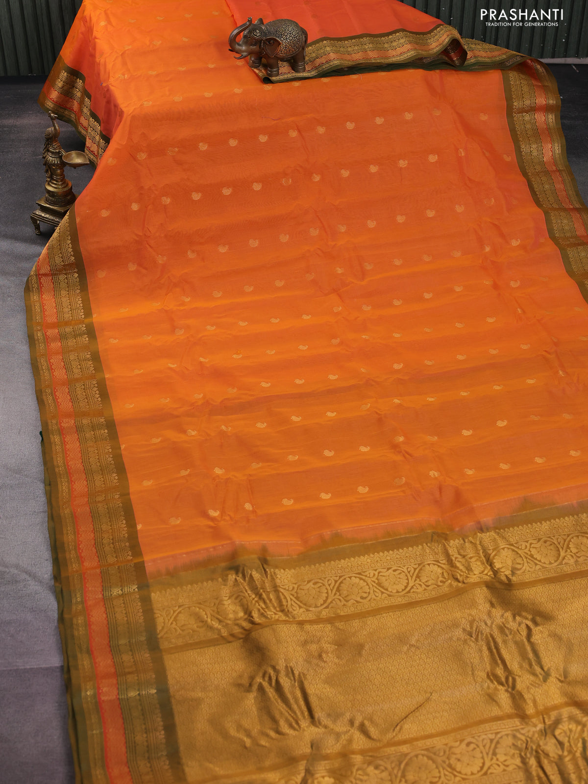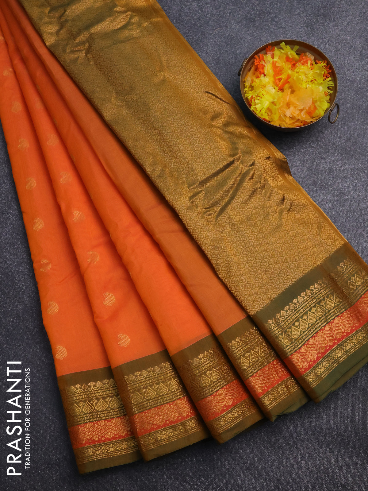 Gadwal silk cotton saree sunset orange and dual shade of green with zari woven paisley buttas and zari woven border