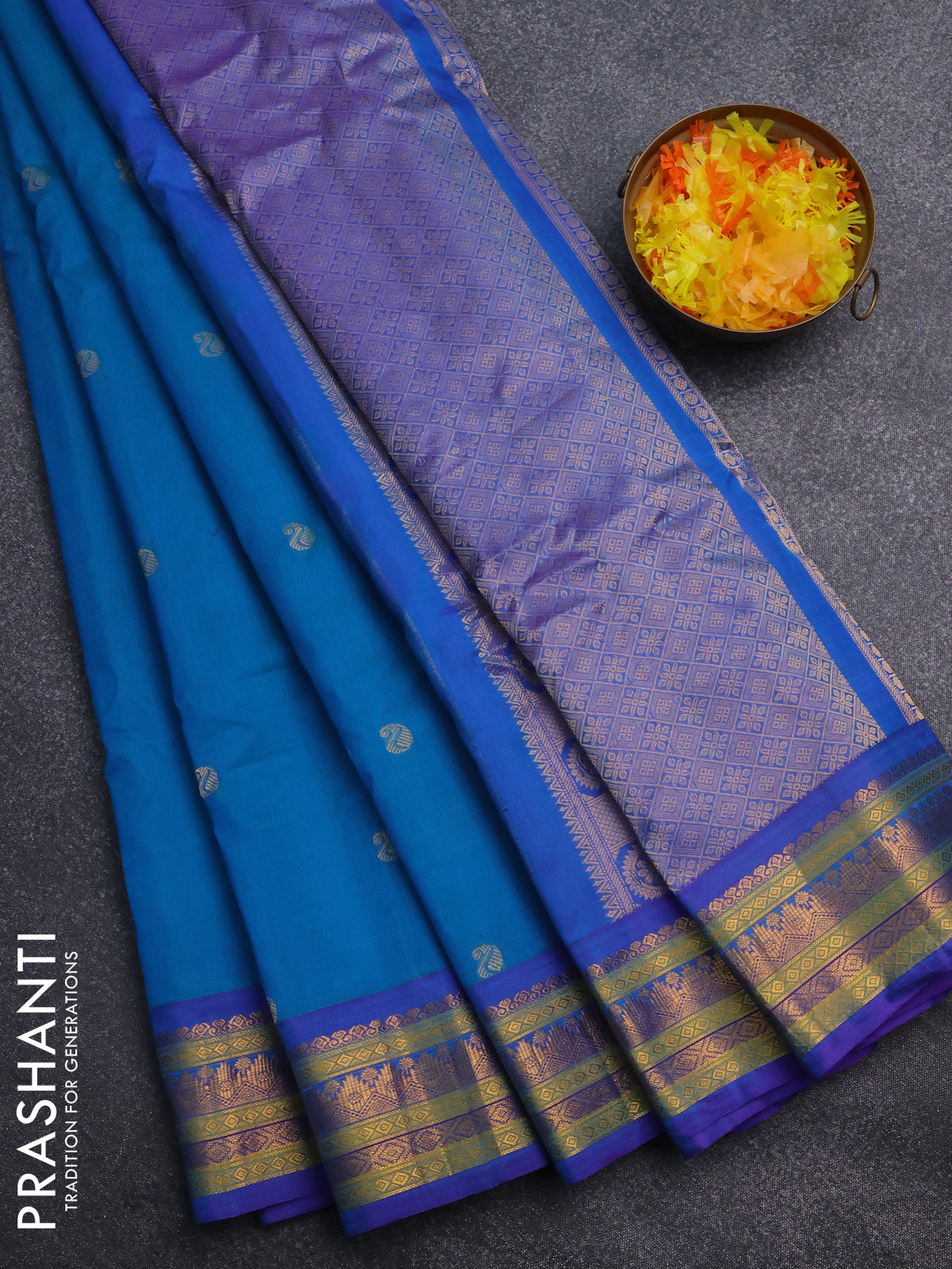 Gadwal silk cotton saree teal blue and purple with zari woven paisley buttas and zari woven border
