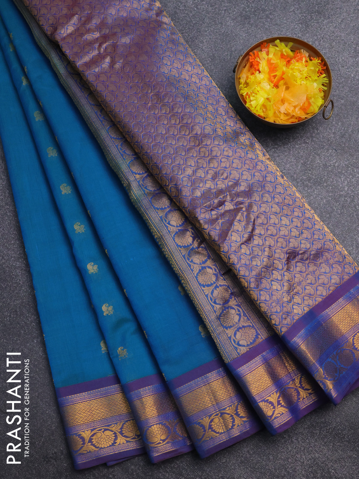 Gadwal silk cotton saree teal bluish green and purple with allover zari woven paisley buttas and zari woven border