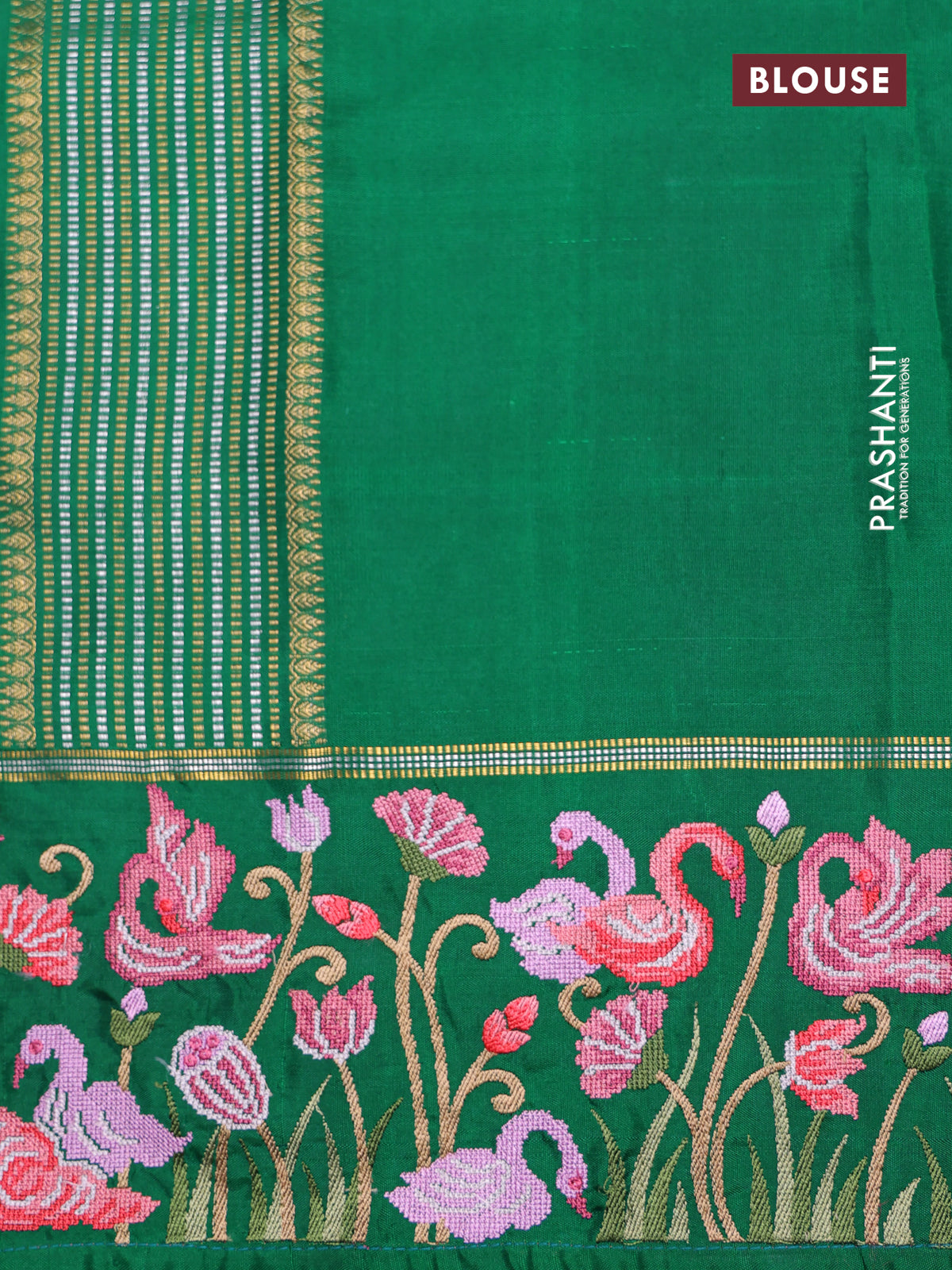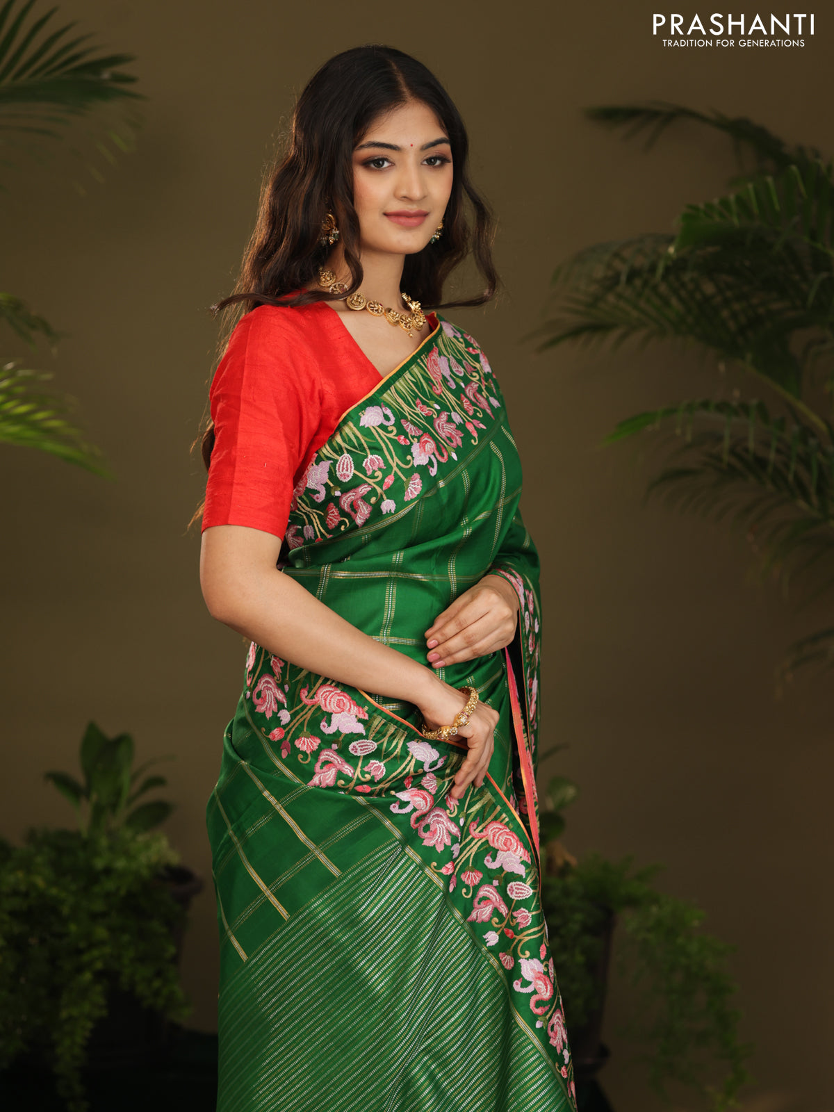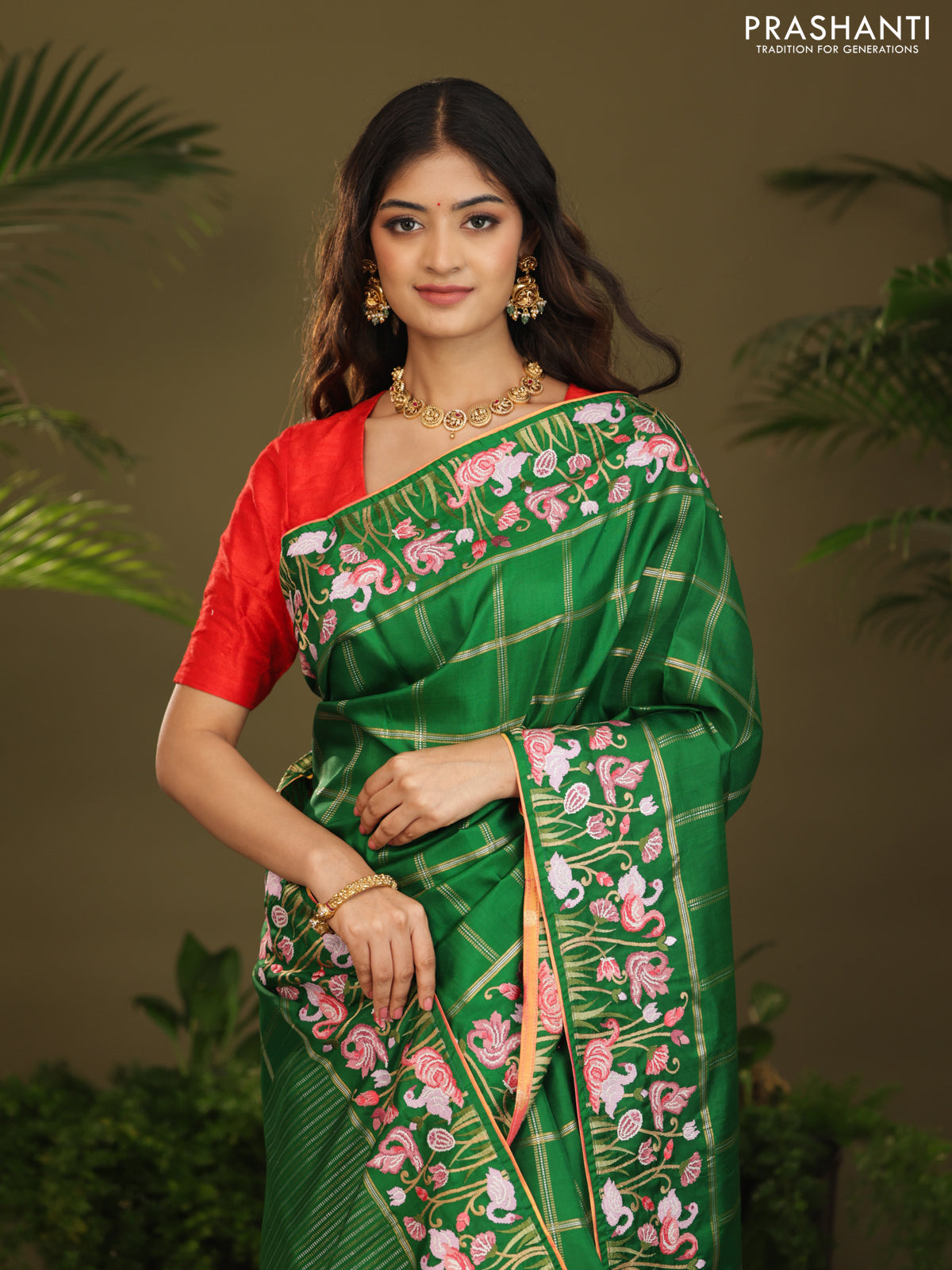 Green kanchipuram silk saree with allover zari checks & border embroidery