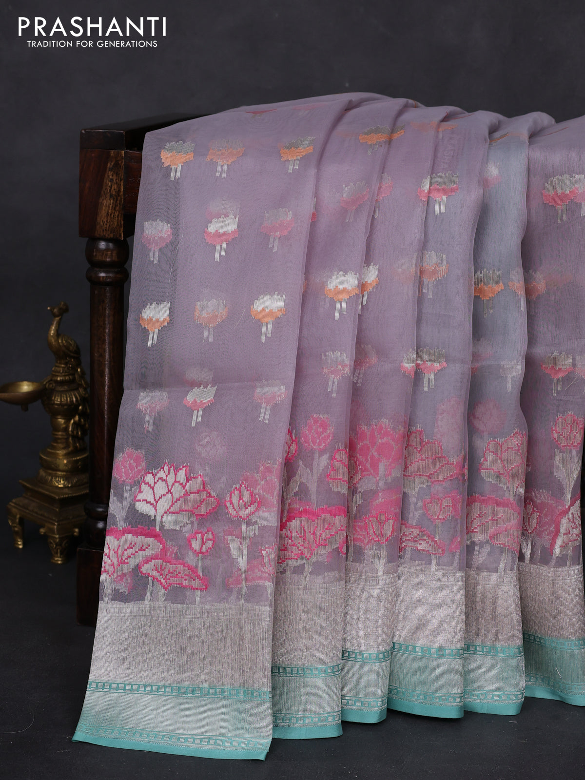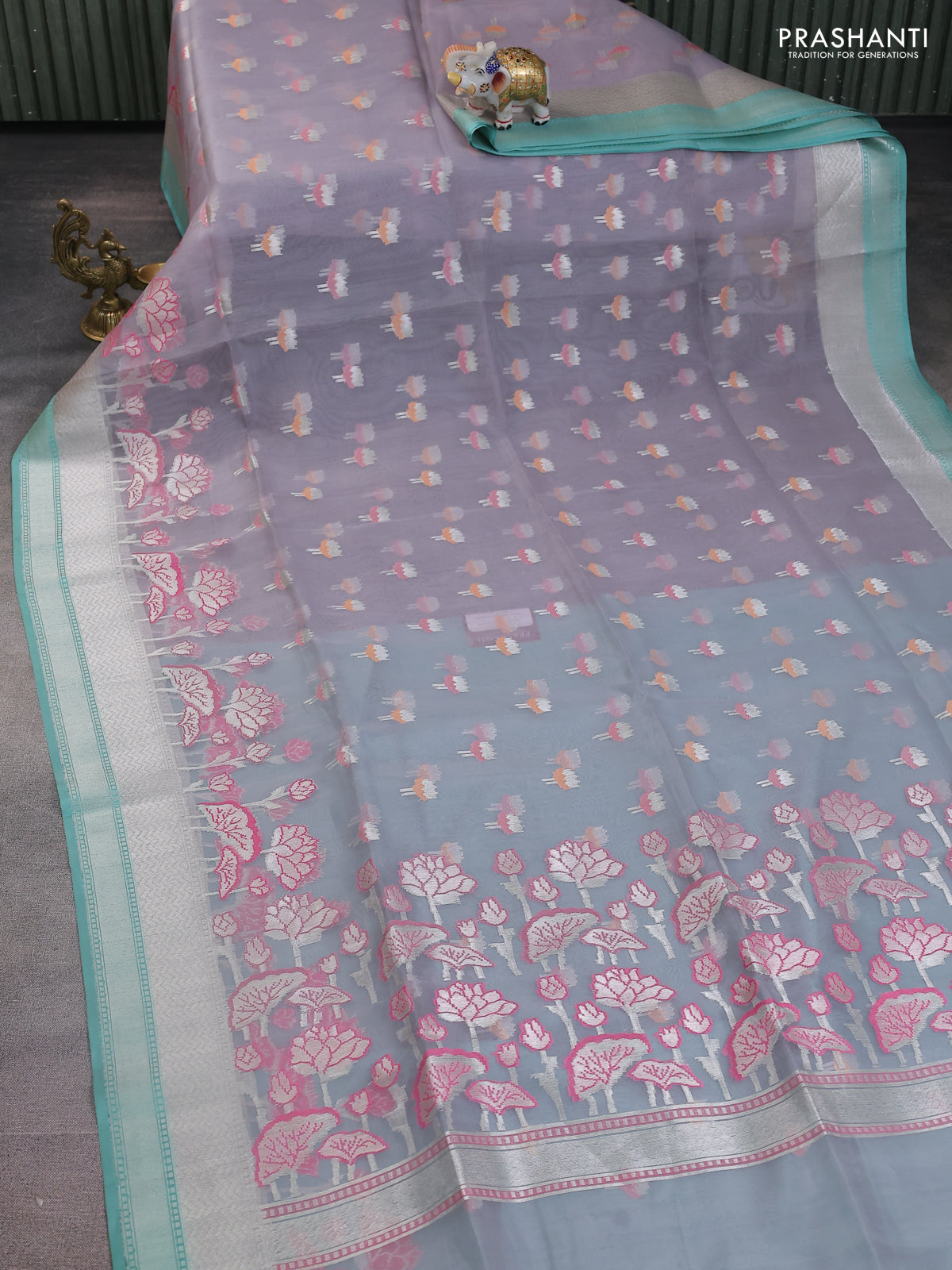 grey and teal blue Banarasi kora jamdhani silk saree
