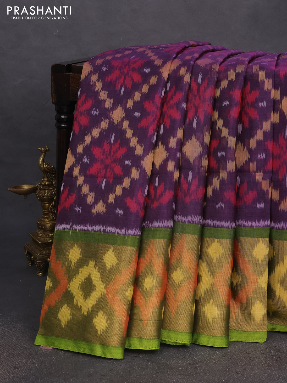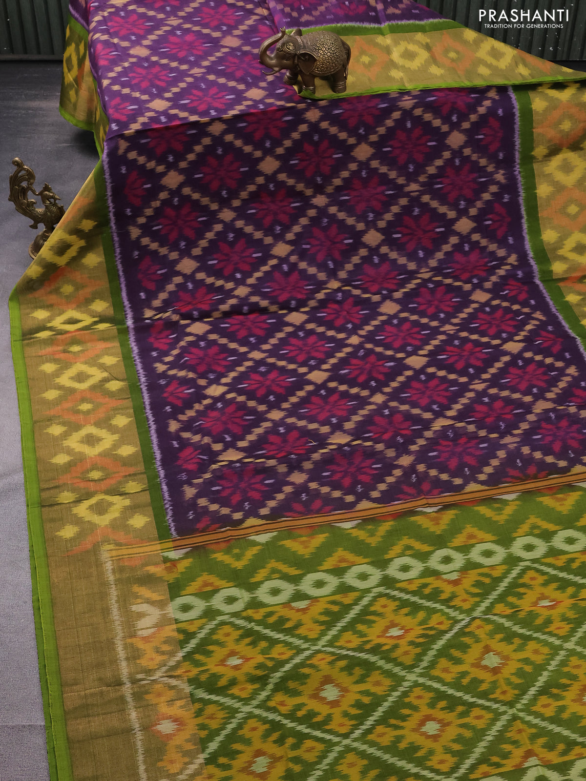 Ikat silk cotton saree deep violet and mehendi green with allover ikat weaves and long ikat woven zari border