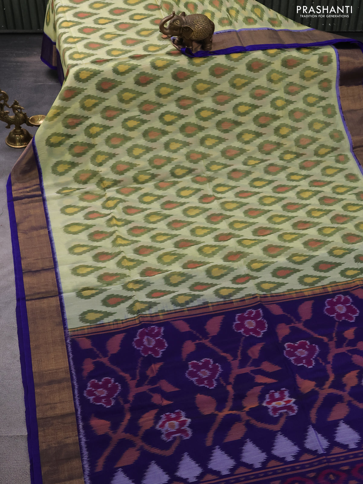 Ikat silk cotton saree pista green and blue with allover ikat weaves and zari woven border