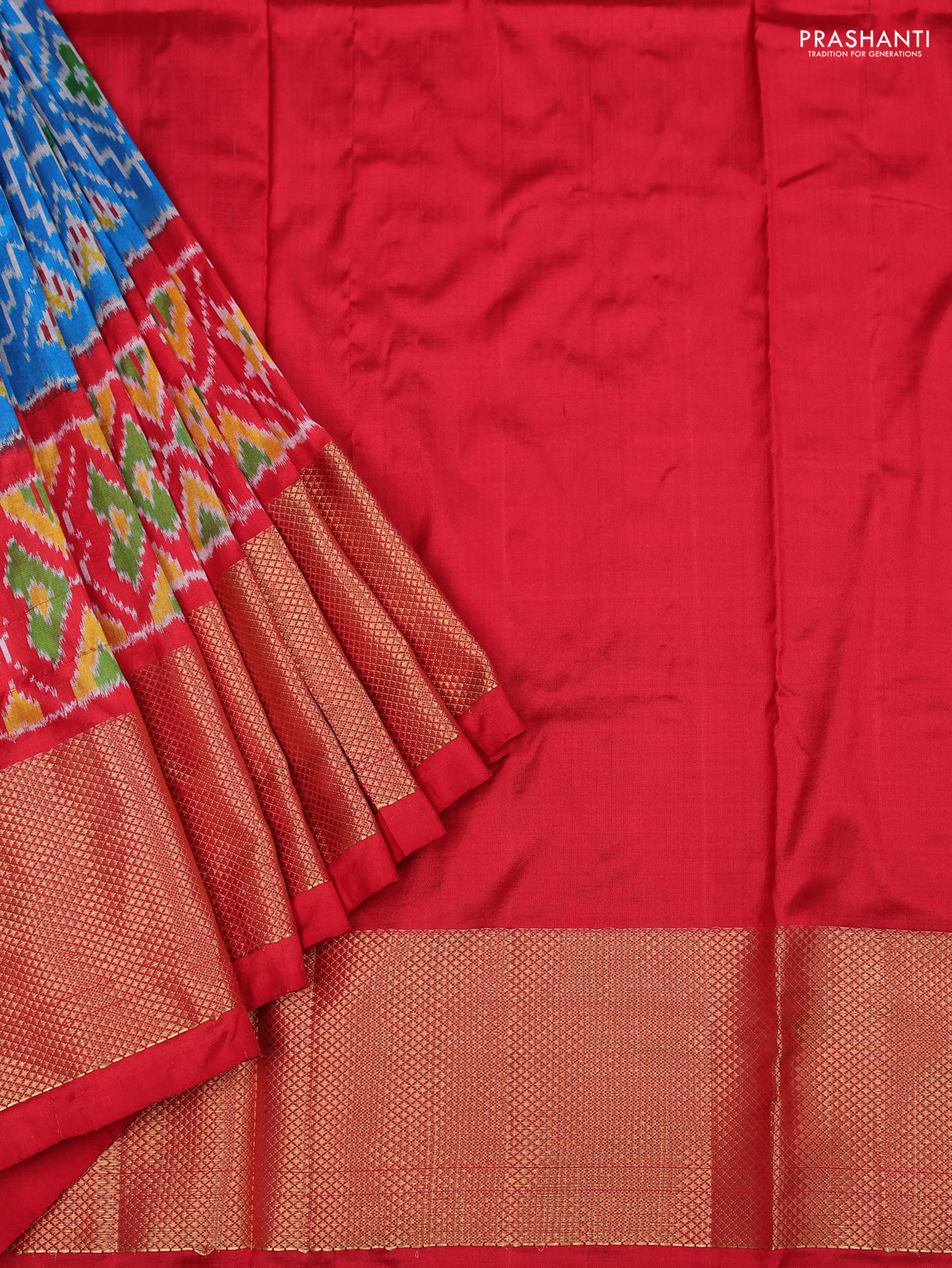 Ikat silk kids lehenga cs blue and red with allover ikat weaves and zari woven border