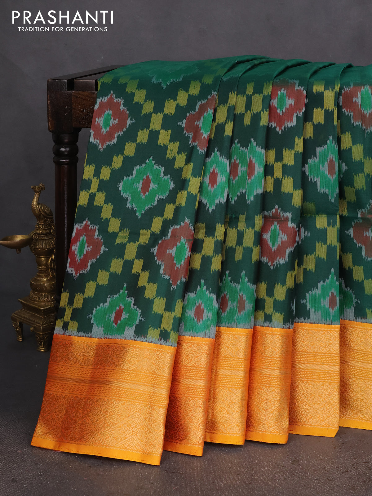 Ikat soft silk saree bottle green and yellow with allover ikat weaves and zari woven border