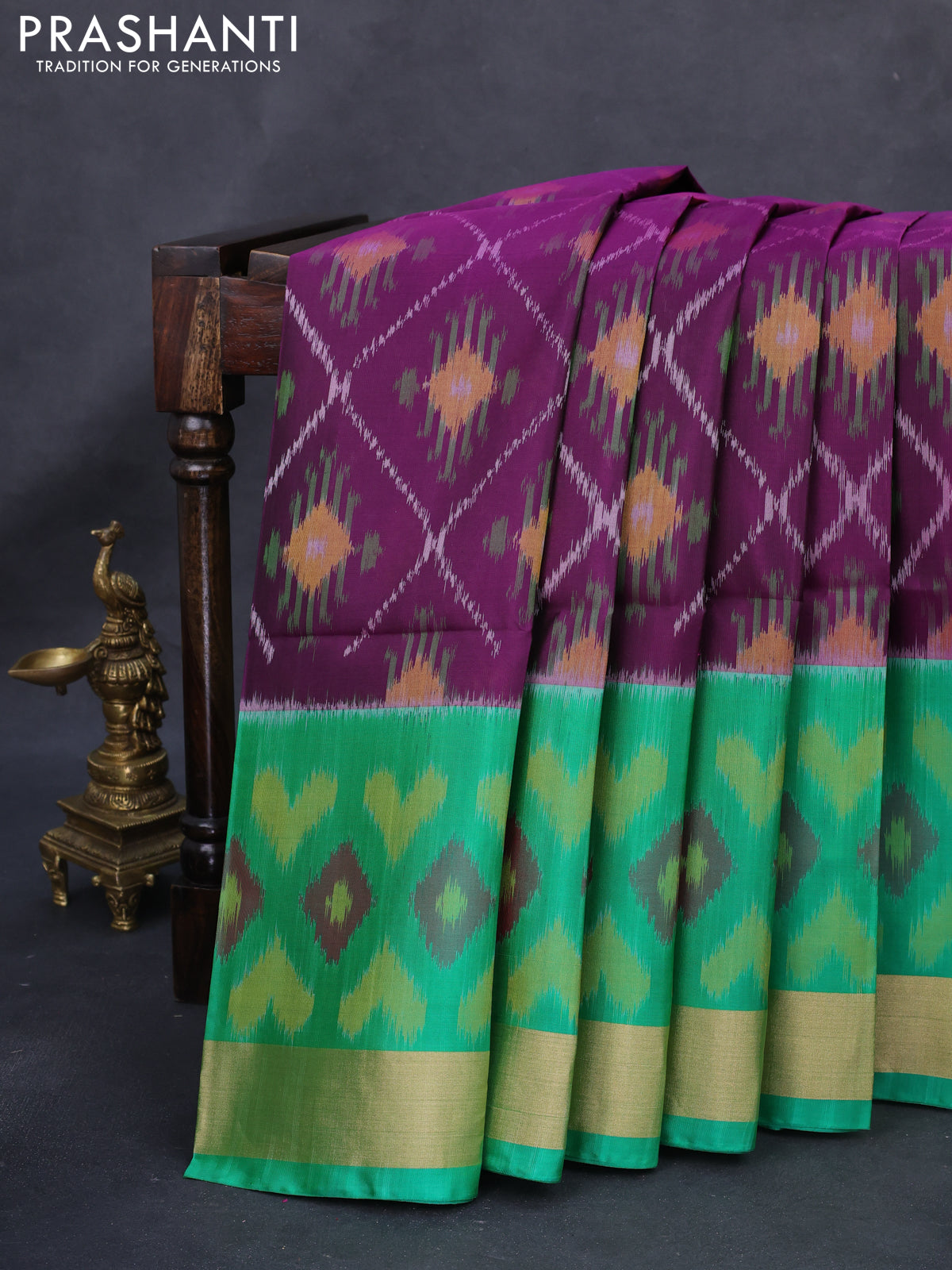 Ikat soft silk saree deep purple and green with allover ikat weaves and long zari woven ikat style border