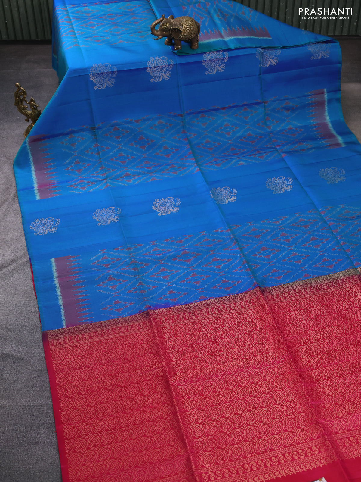 Ikat soft silk saree dual shade of bluish green and pink with allover ikat weaves & floral zari buttas in borderless style