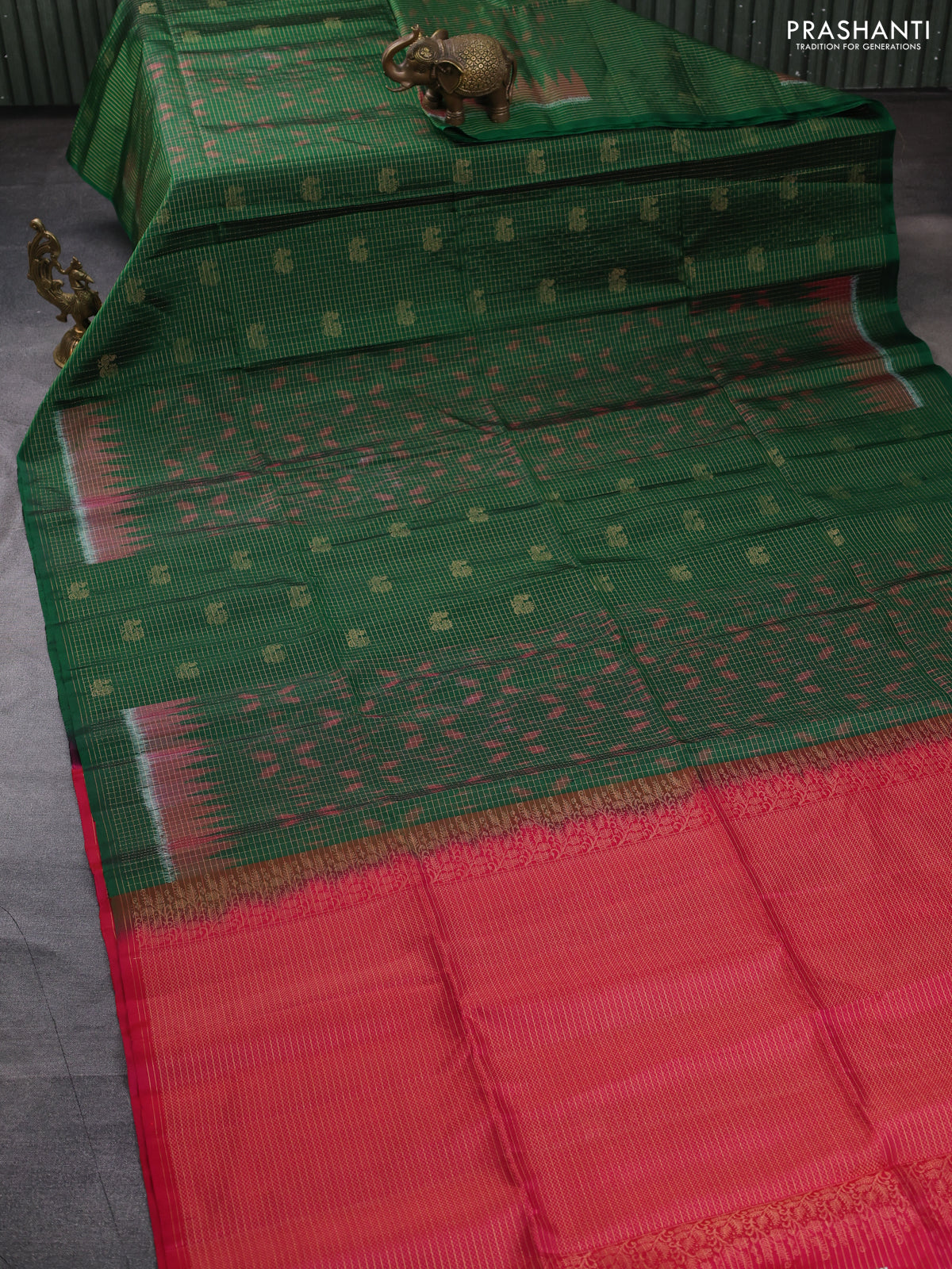Ikat soft silk saree green and pink with allover zari checks & ikat weaves in borderless style