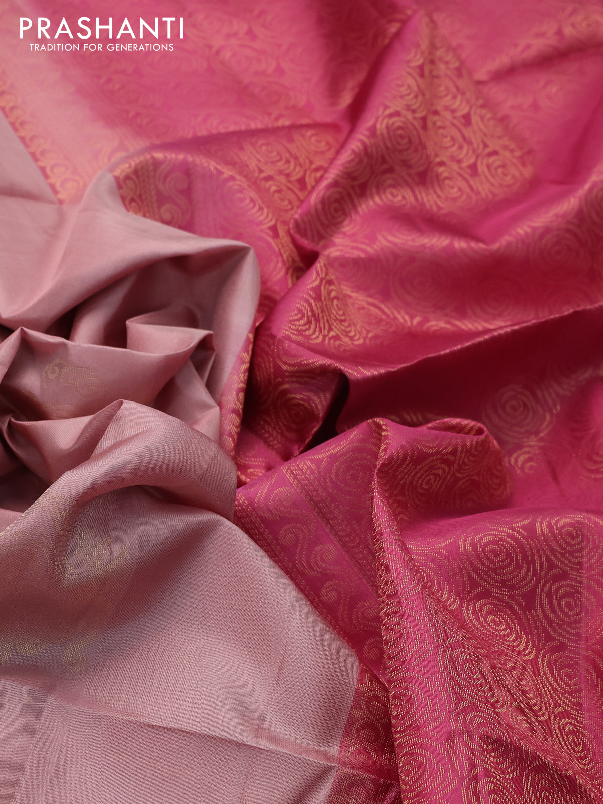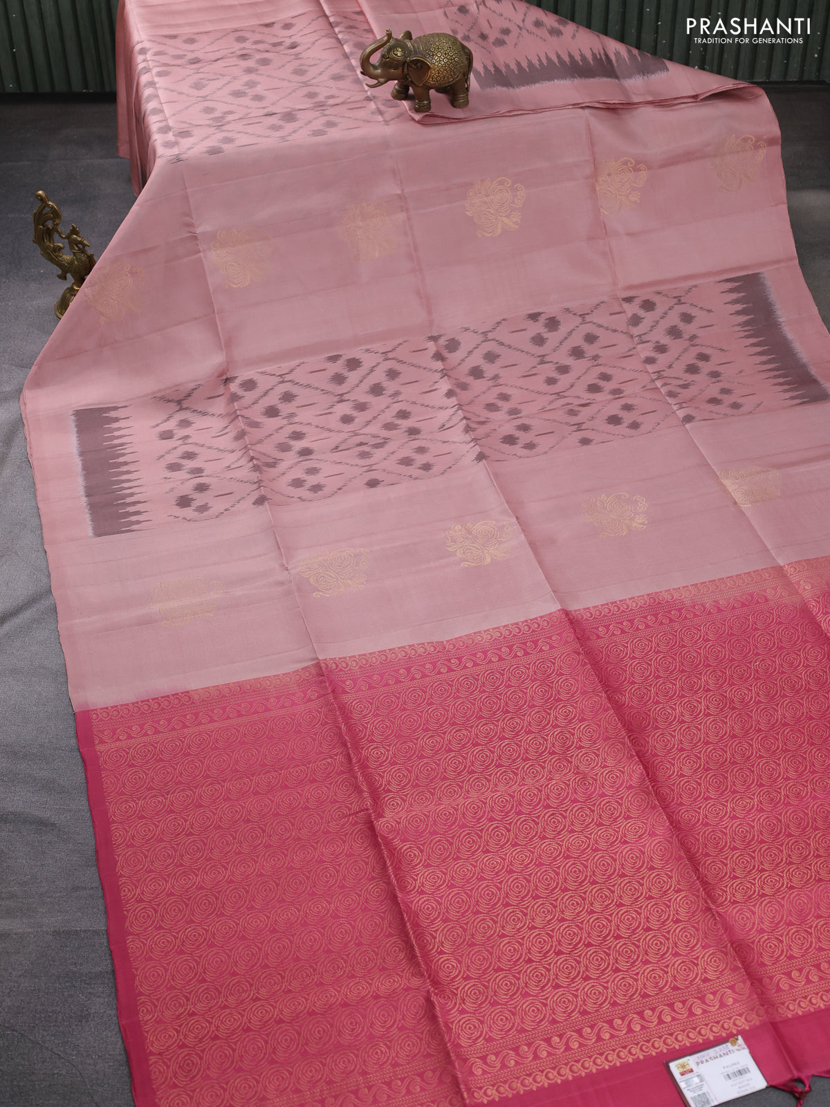 Ikat soft silk saree pastel peach and pink with allover ikat weaves & floral zari buttas in borderless style