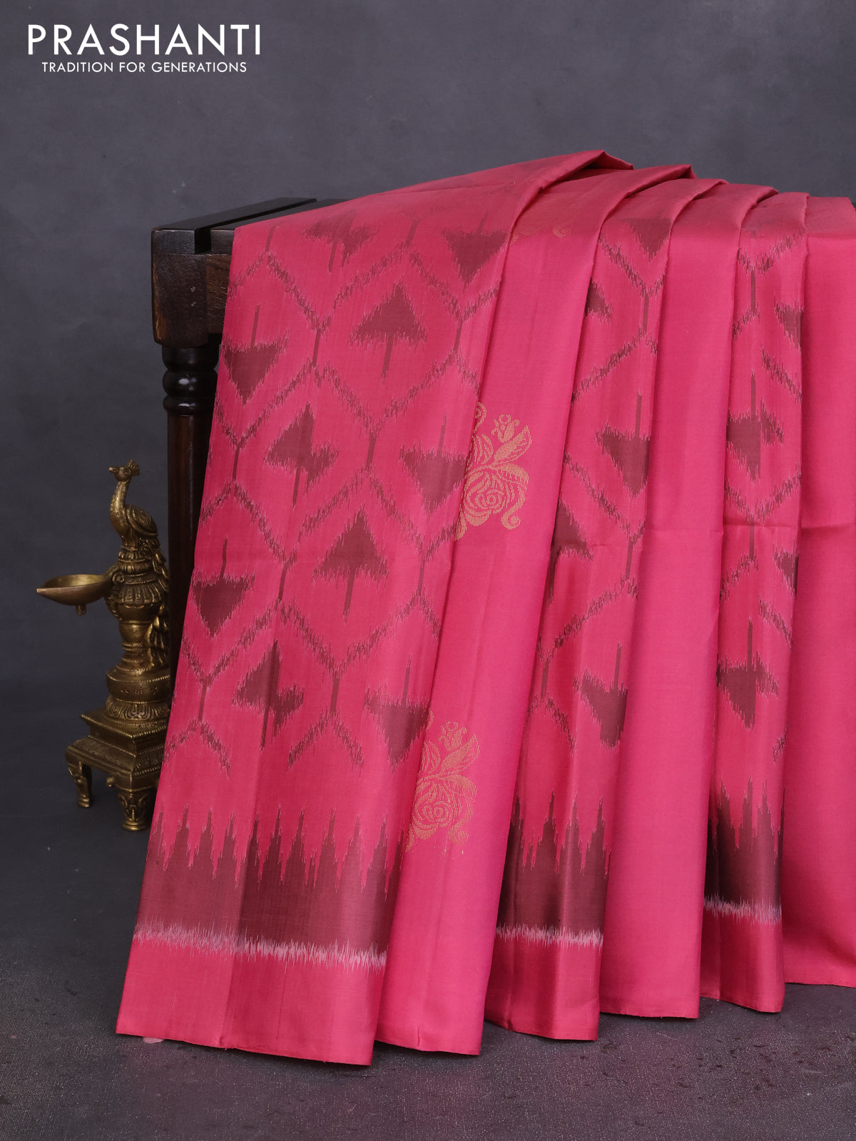 Ikat soft silk saree pink shade and dark sandal with allover ikat weaves & floral zari buttas in borderless style