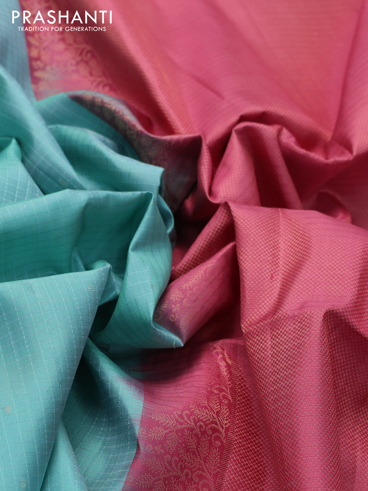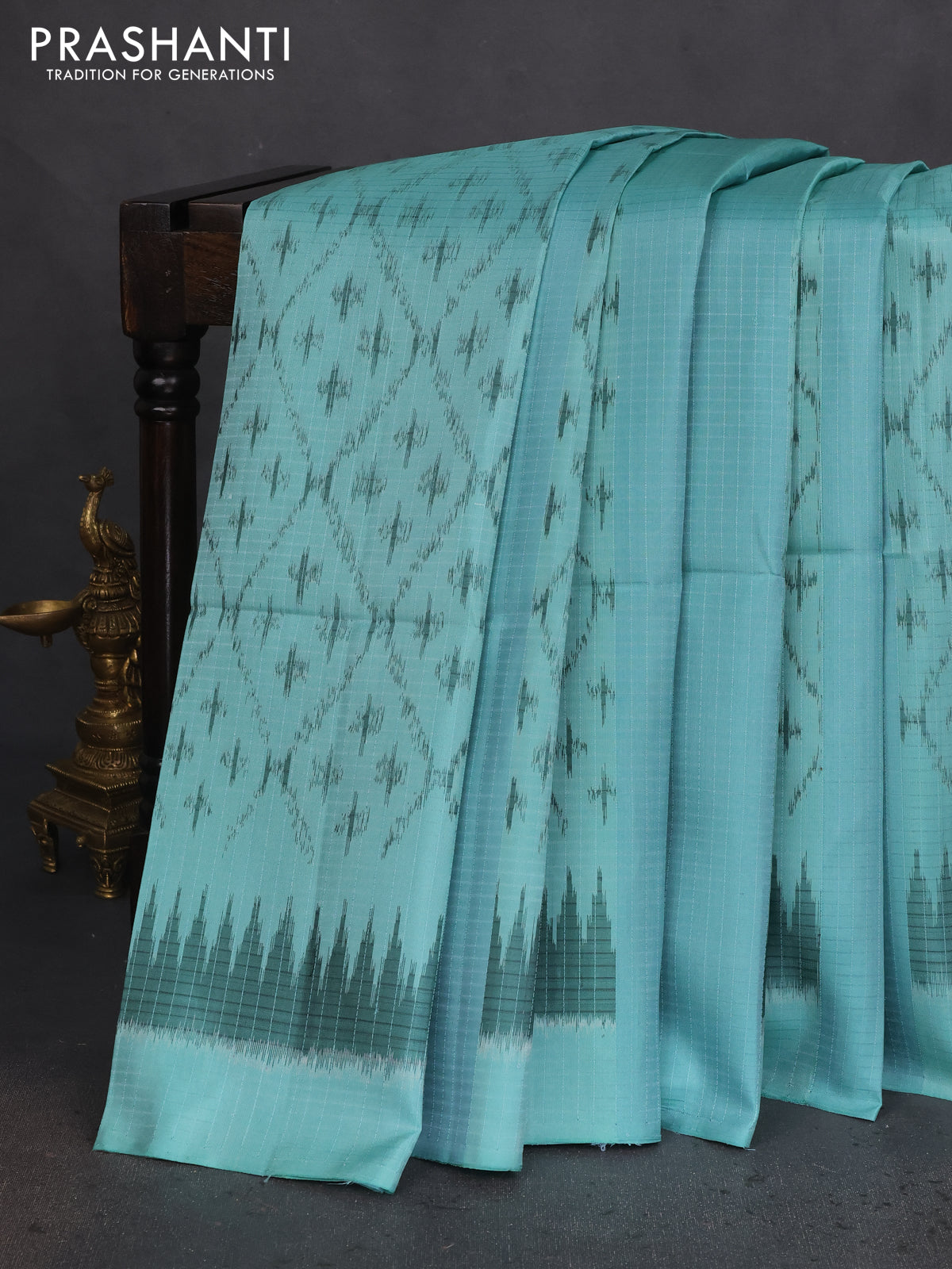 Ikat soft silk saree teal blue and peach pink with allover ikat weaves & zari buttas in borderless style