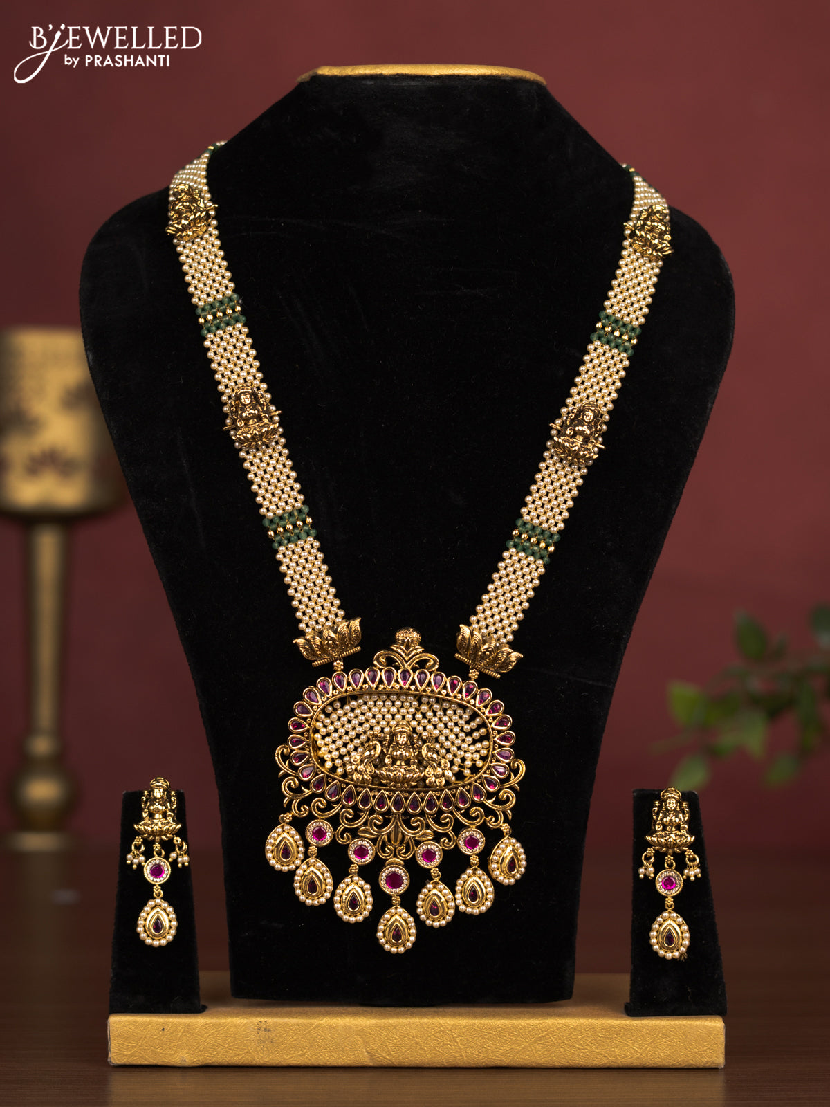 Jadau beade haaram lakshmi pendant with pink jadau stones and hangings