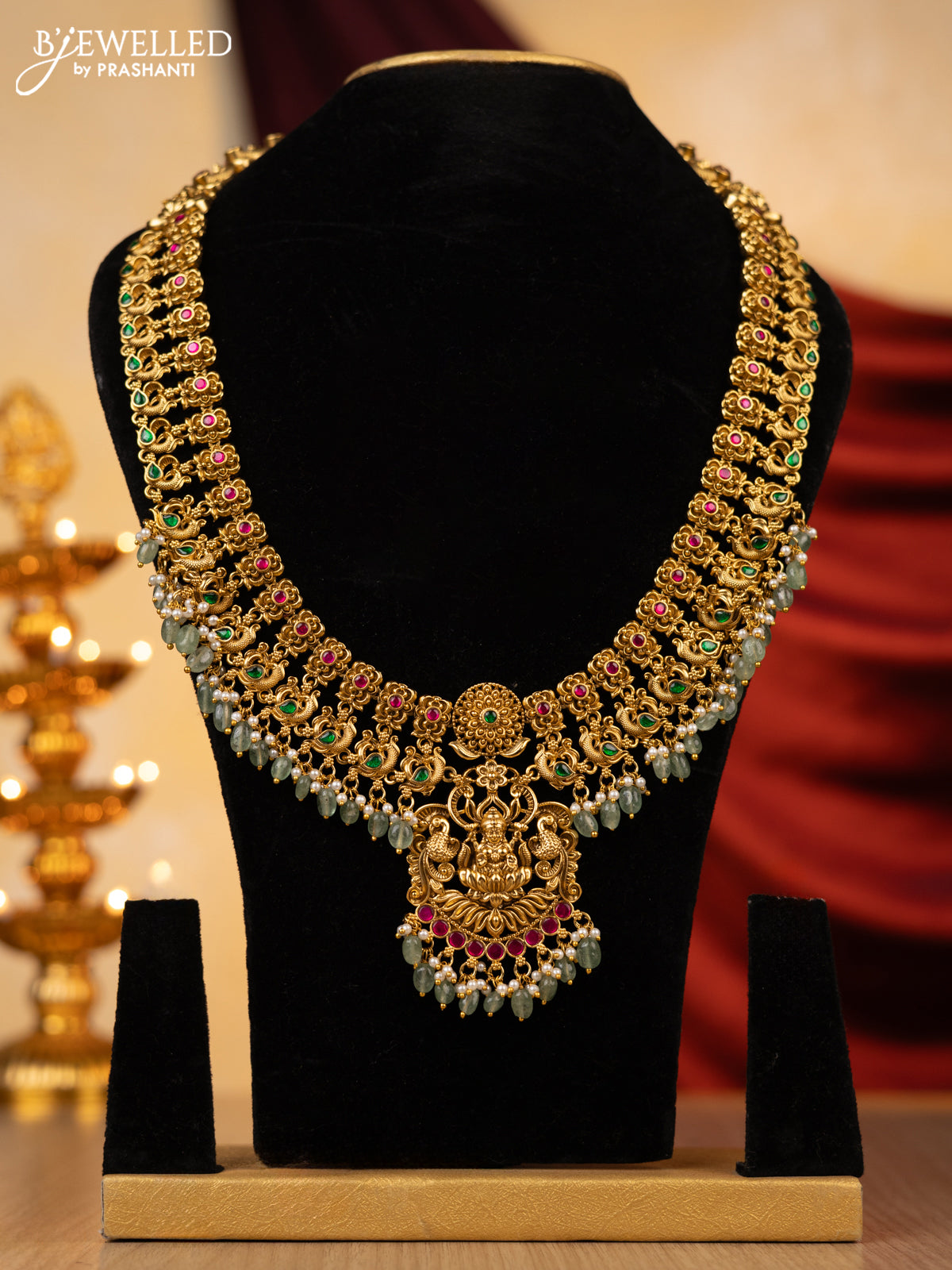 Jadau haaram lakshmi design with jadau kundan stones with natural beads hanging without earing