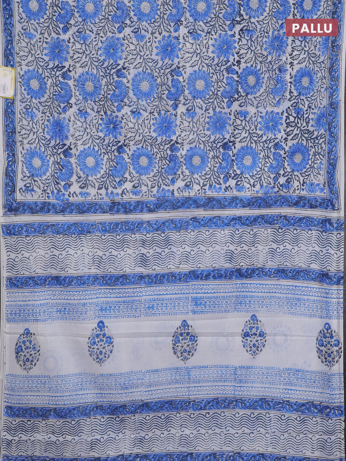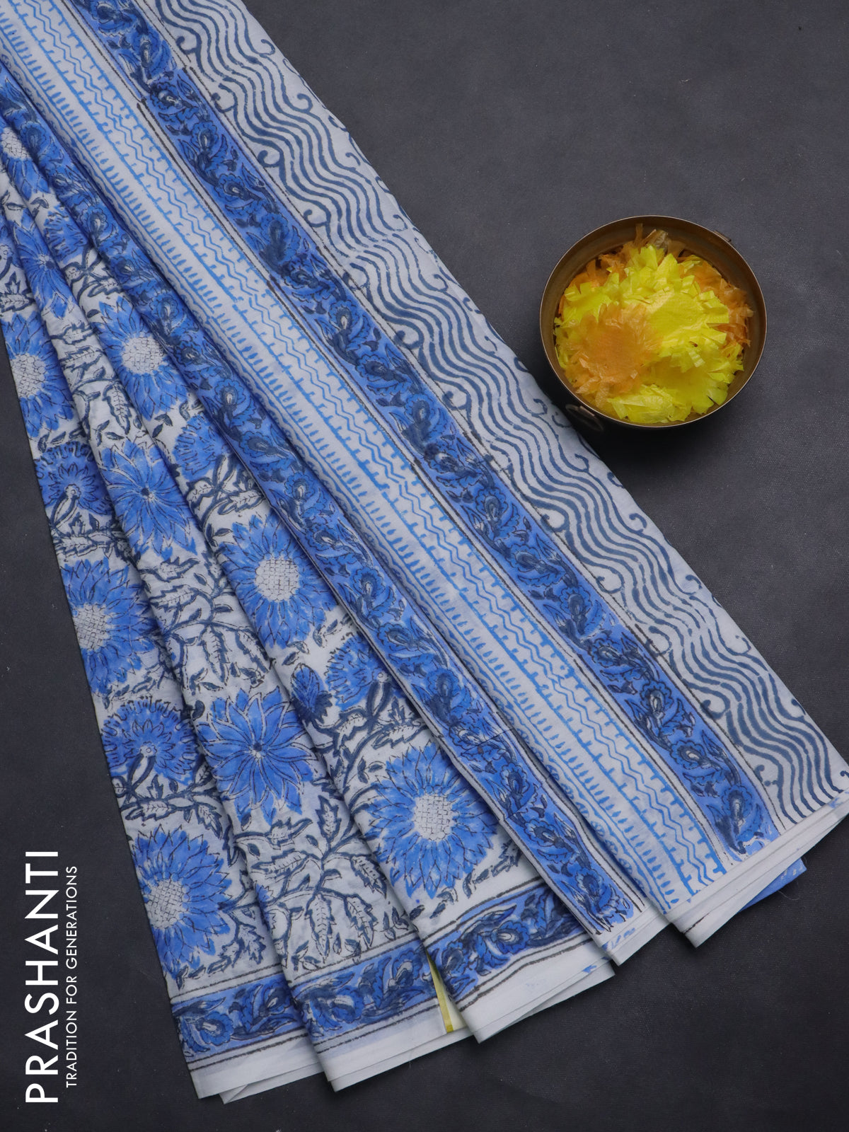 Jaipur cotton saree off white and blue with allover floral prints and printed border