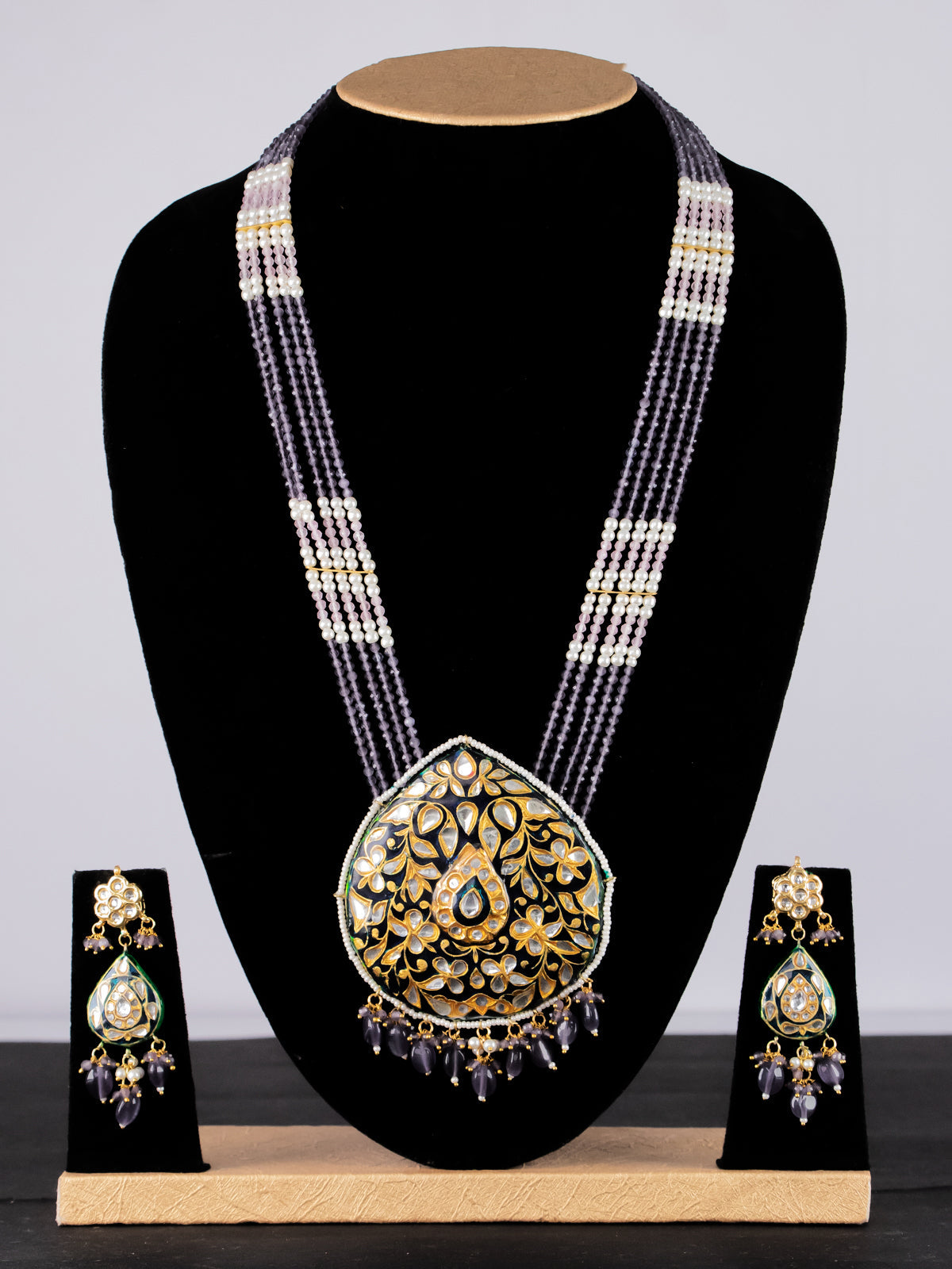 Jaipur crystal beaded grey mid length necklace with minakari pendant and hangings