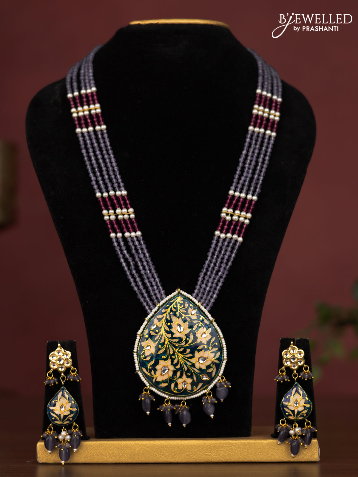 Jaipur crystal beaded violet length necklace with minakari pendant and hangings