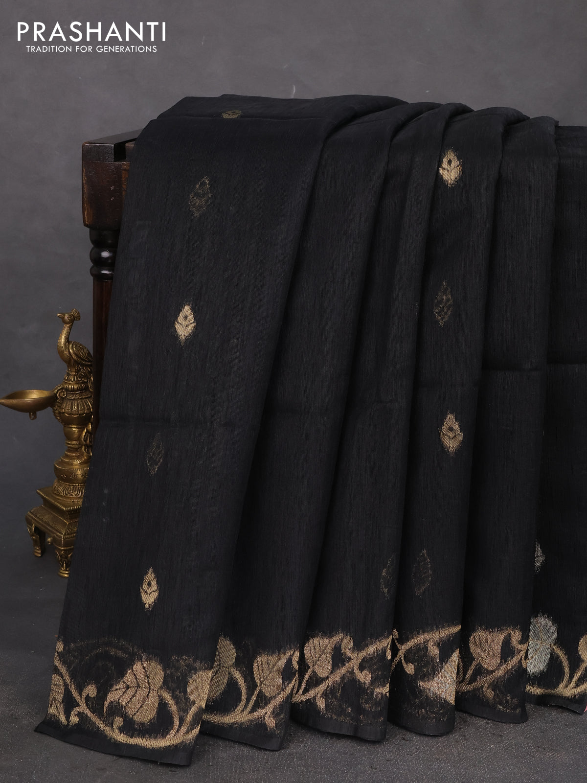 Jute linen saree black with zari woven buttas and leaf zari woven border