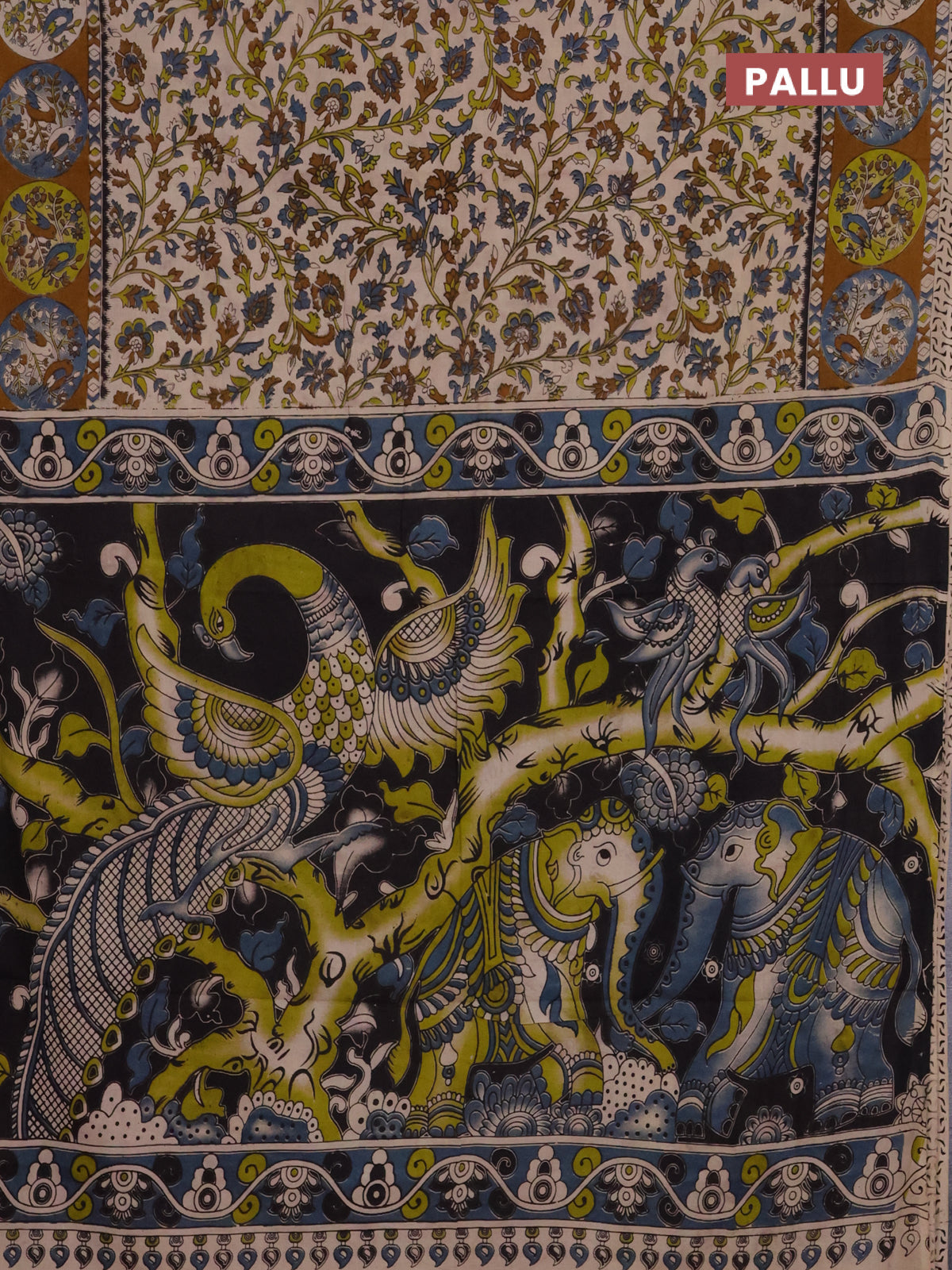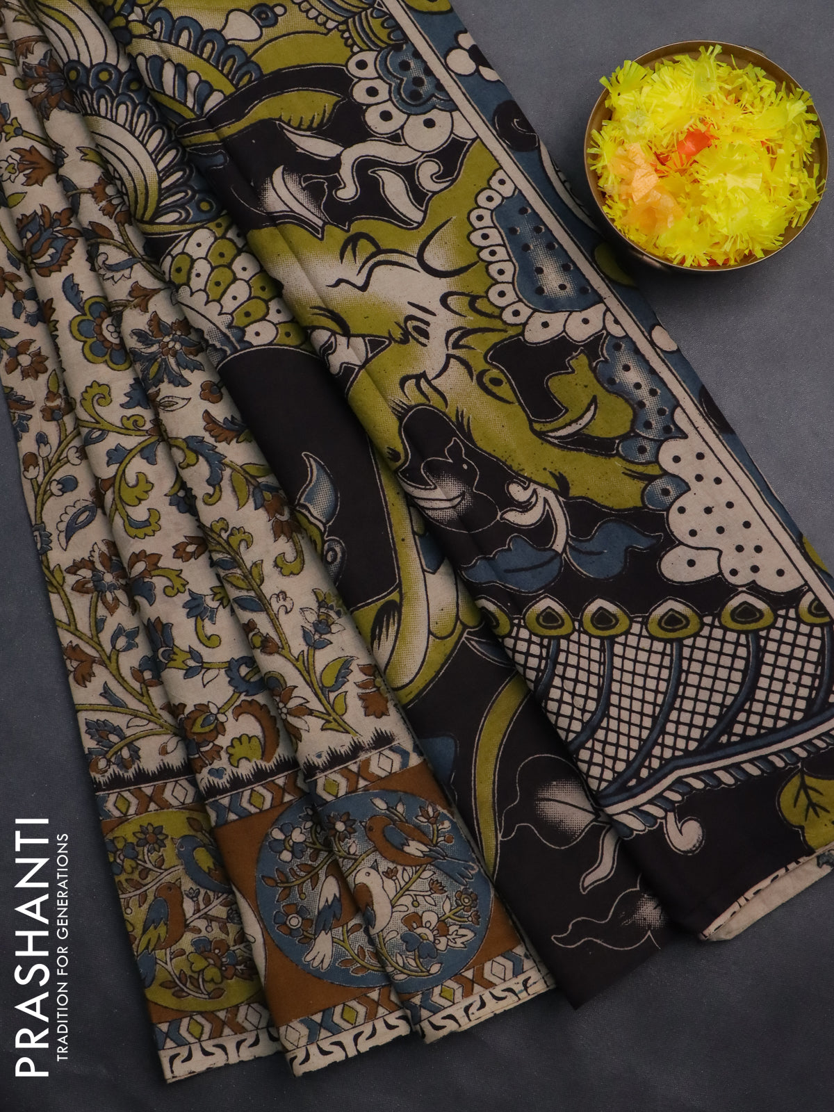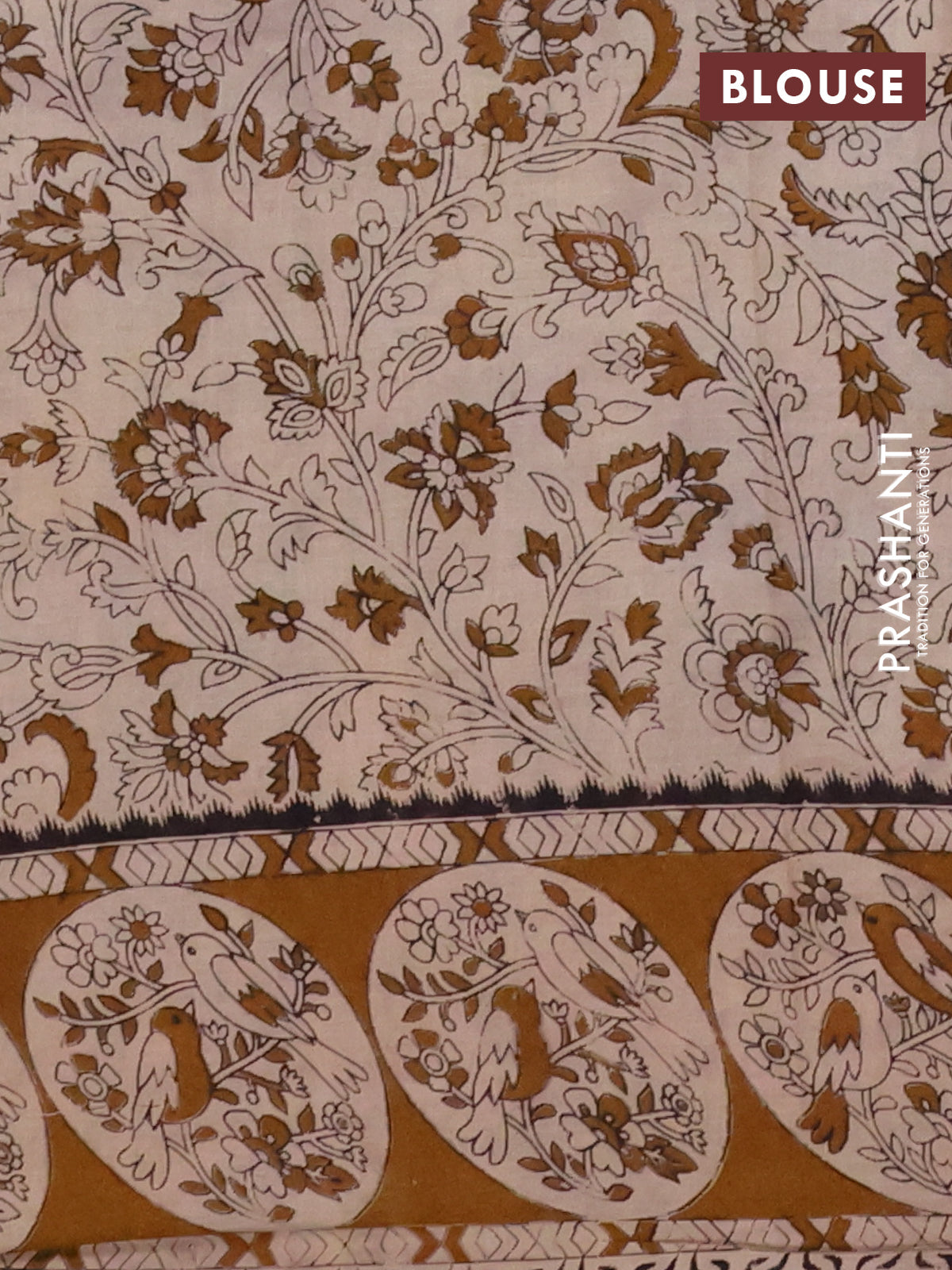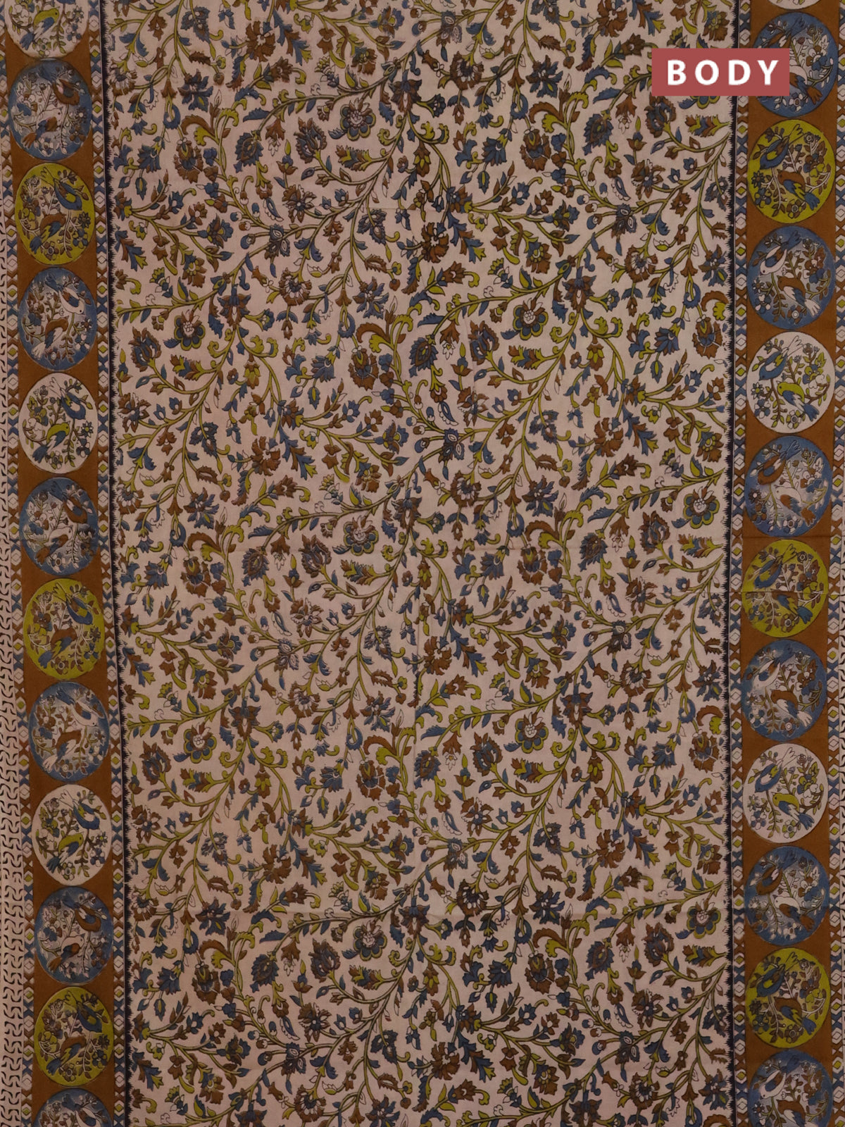 Kalamkari cotton saree beige and dark mustard with allover prints and printed border