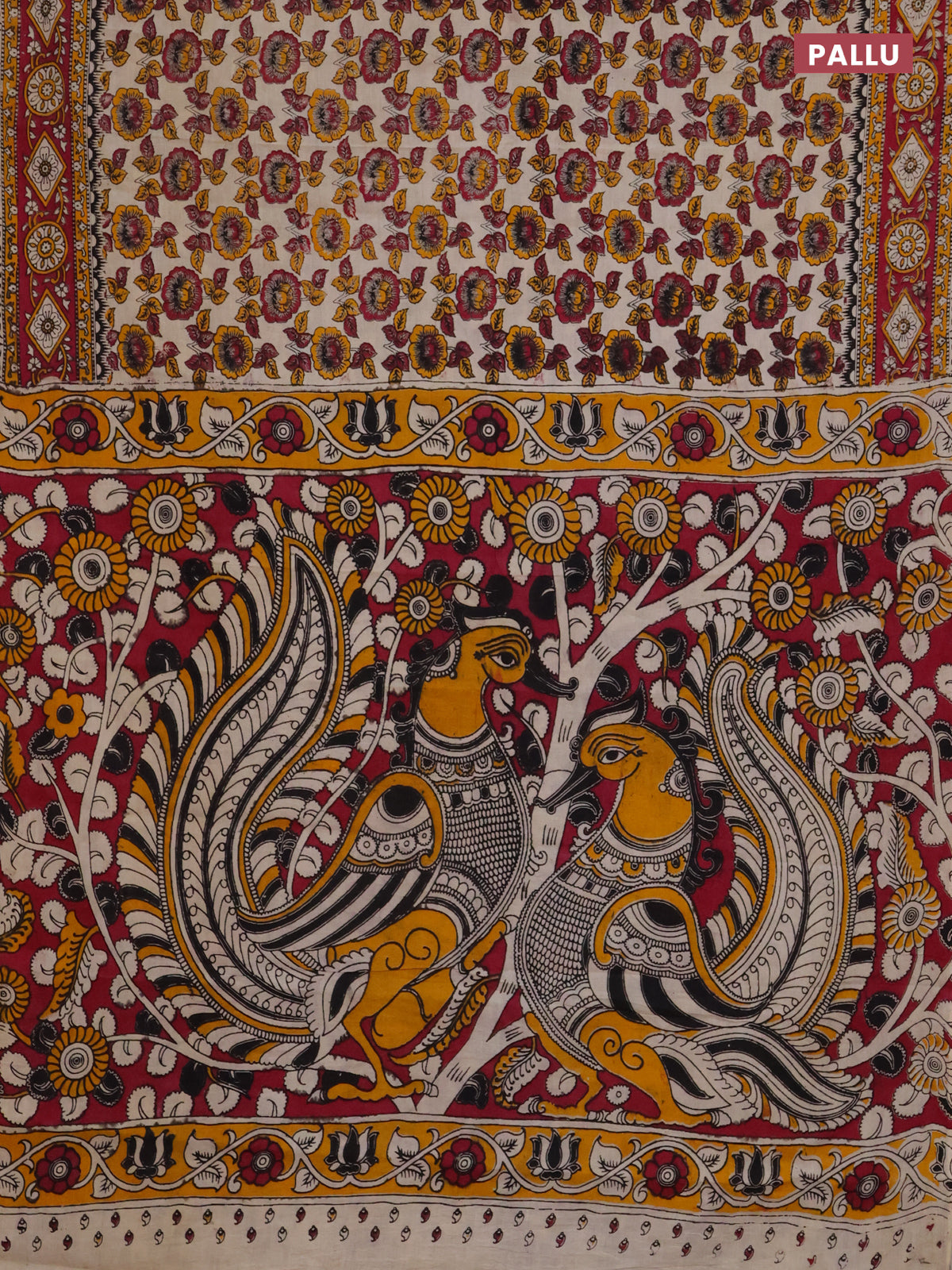 Kalamkari cotton saree beige and dark pink with allover prints and printed border