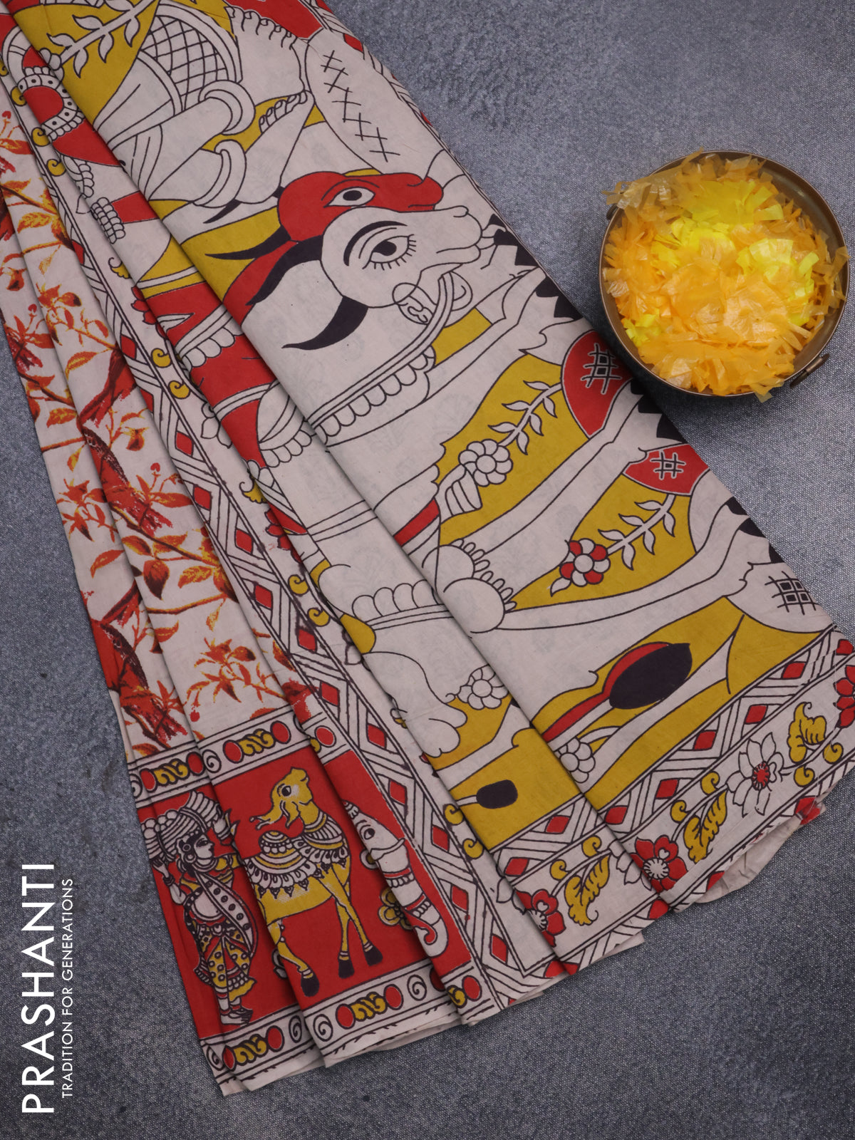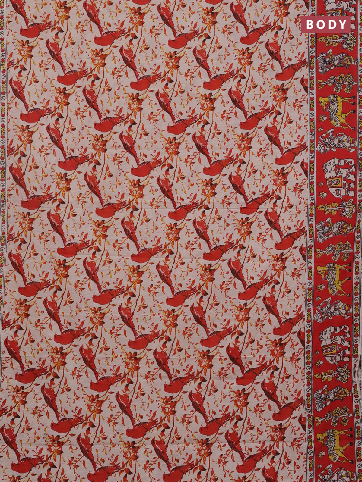 Kalamkari cotton saree beige and red with allover prints and printed border