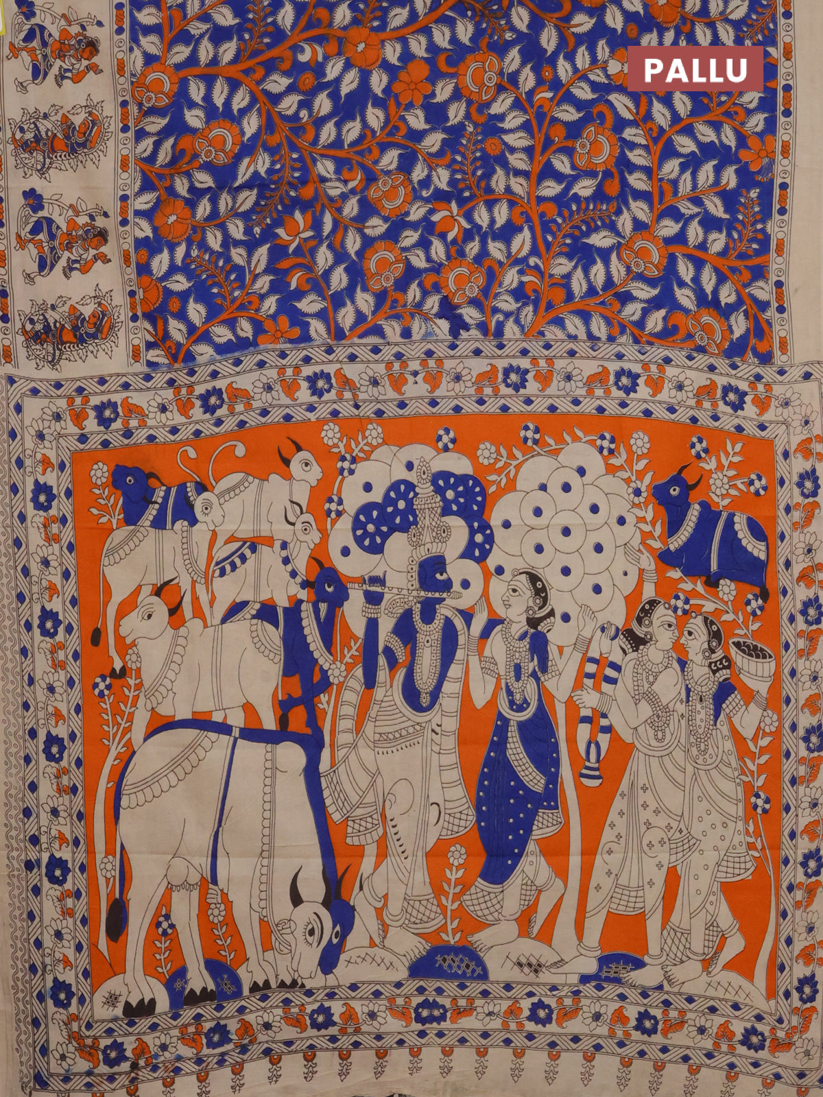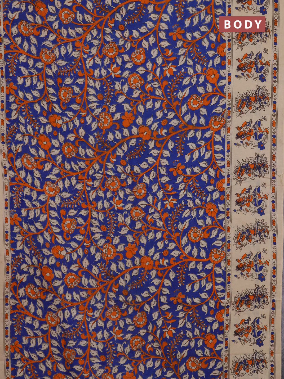 Kalamkari cotton saree blue and beige with allover prints and printed border