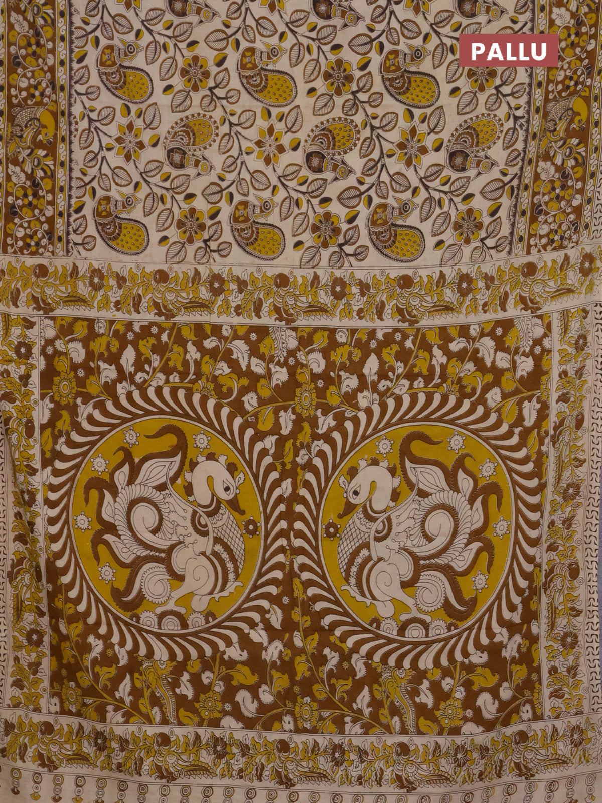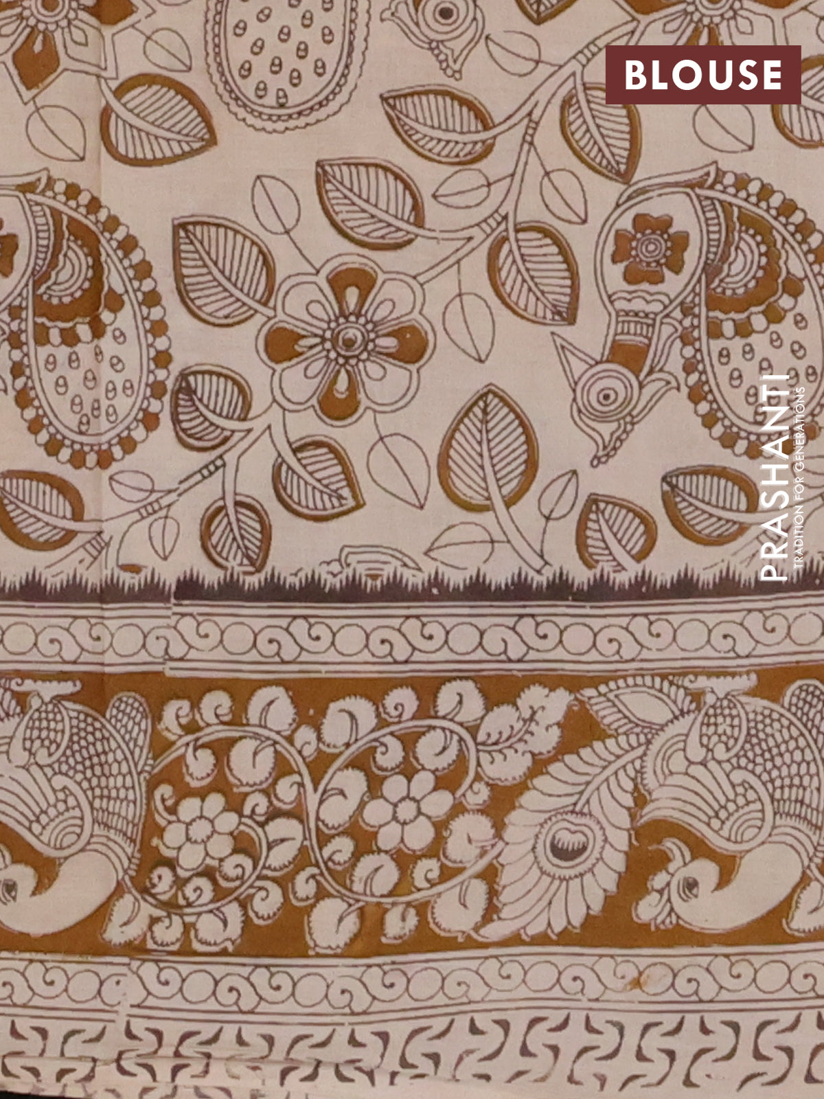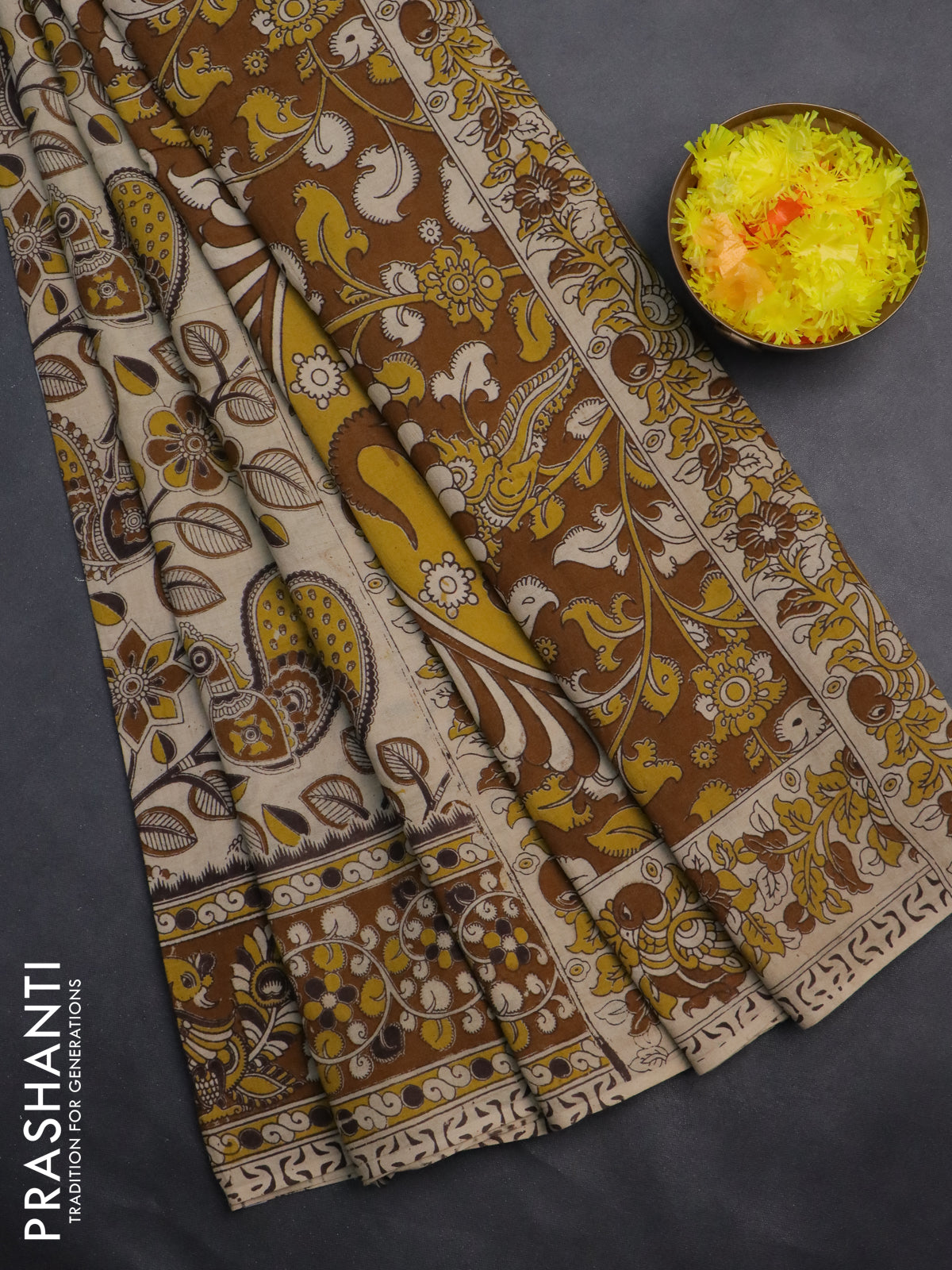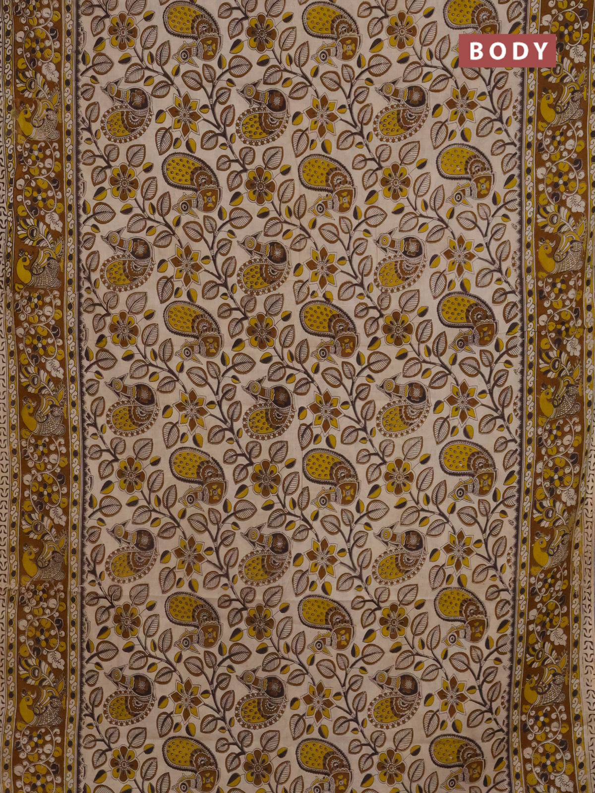 Kalamkari cotton saree cream and dark mustard with allover prints and printed border
